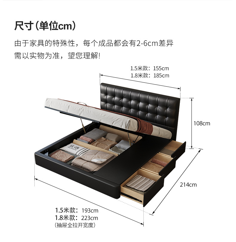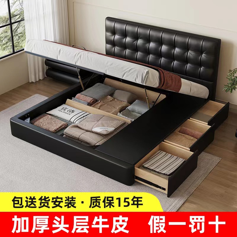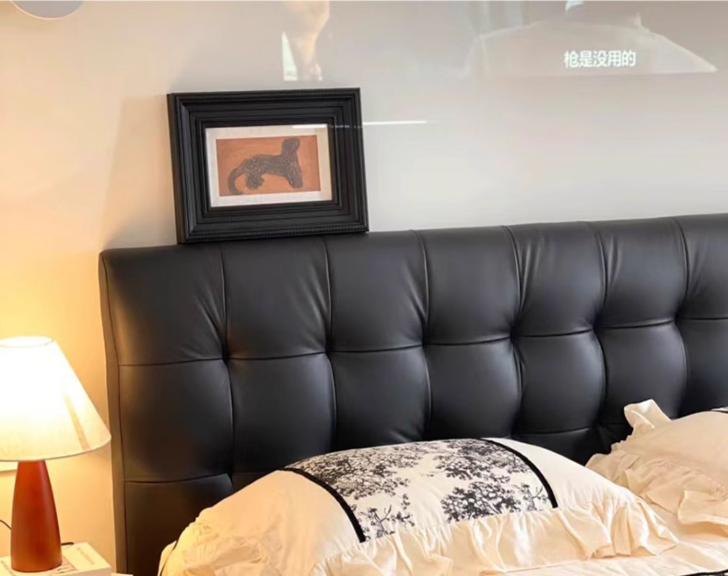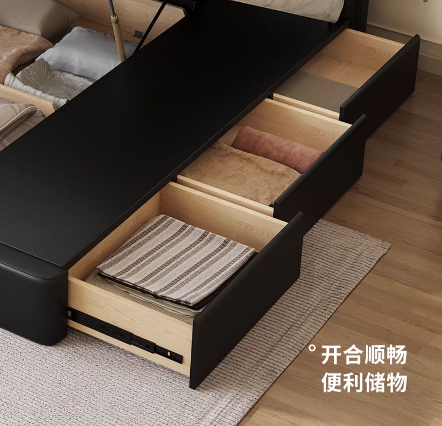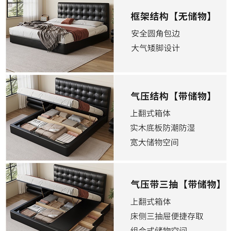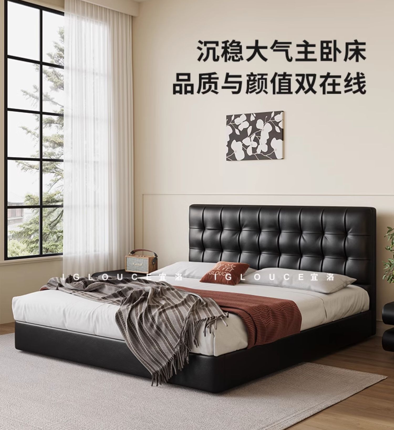 Илуо итальянская минималистская кожаная кровать Черная вафельная кровать Тонкая кровать с боковой кроватью Современная минималистская кровать с высокой коробкой для хранения