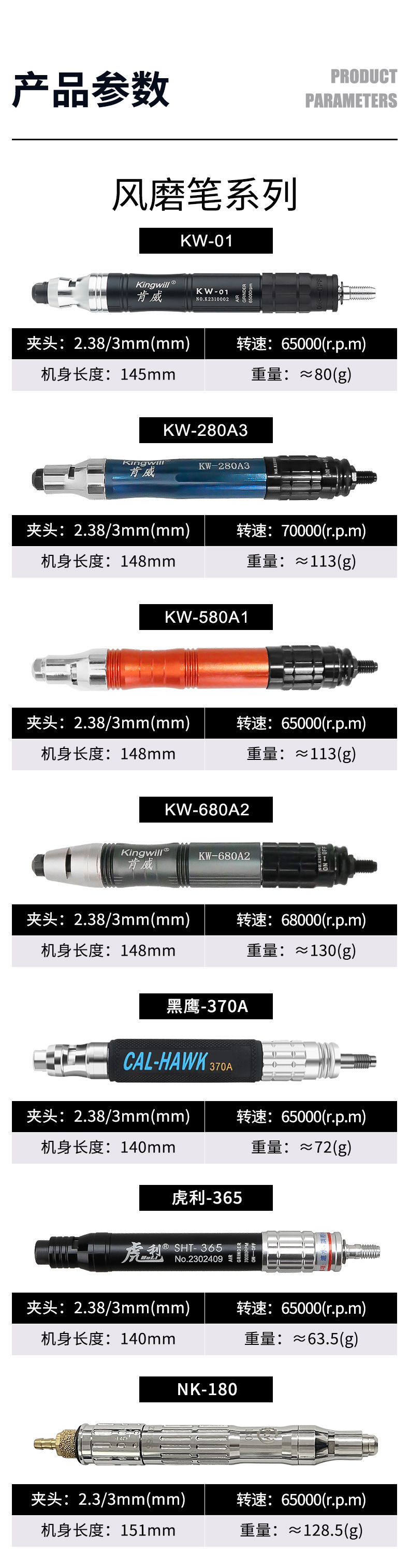 KW-01 [Обновление высокой скорости]; KW-280A3 [Флагманский большой крутящий момент]; KW-580A1 [флагманский промышленный класс]; KW-680A2 [флагманский мощный промышленный класс]; Черный ястреб-370A [Высококачественный высокий крутящий момент]; Хули-365; NK-180; Шлифовальные головки из алмазного сплава 30 палочек; 100 шлифовальных головок красного крема; Шерсть шлифовальная головка 12 палочек; Вольфрамовая сталь вращающаяся шлифовальная головка 10 палочек
