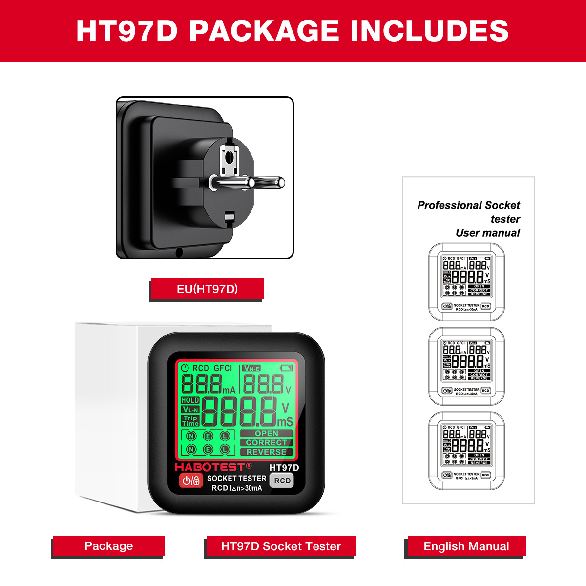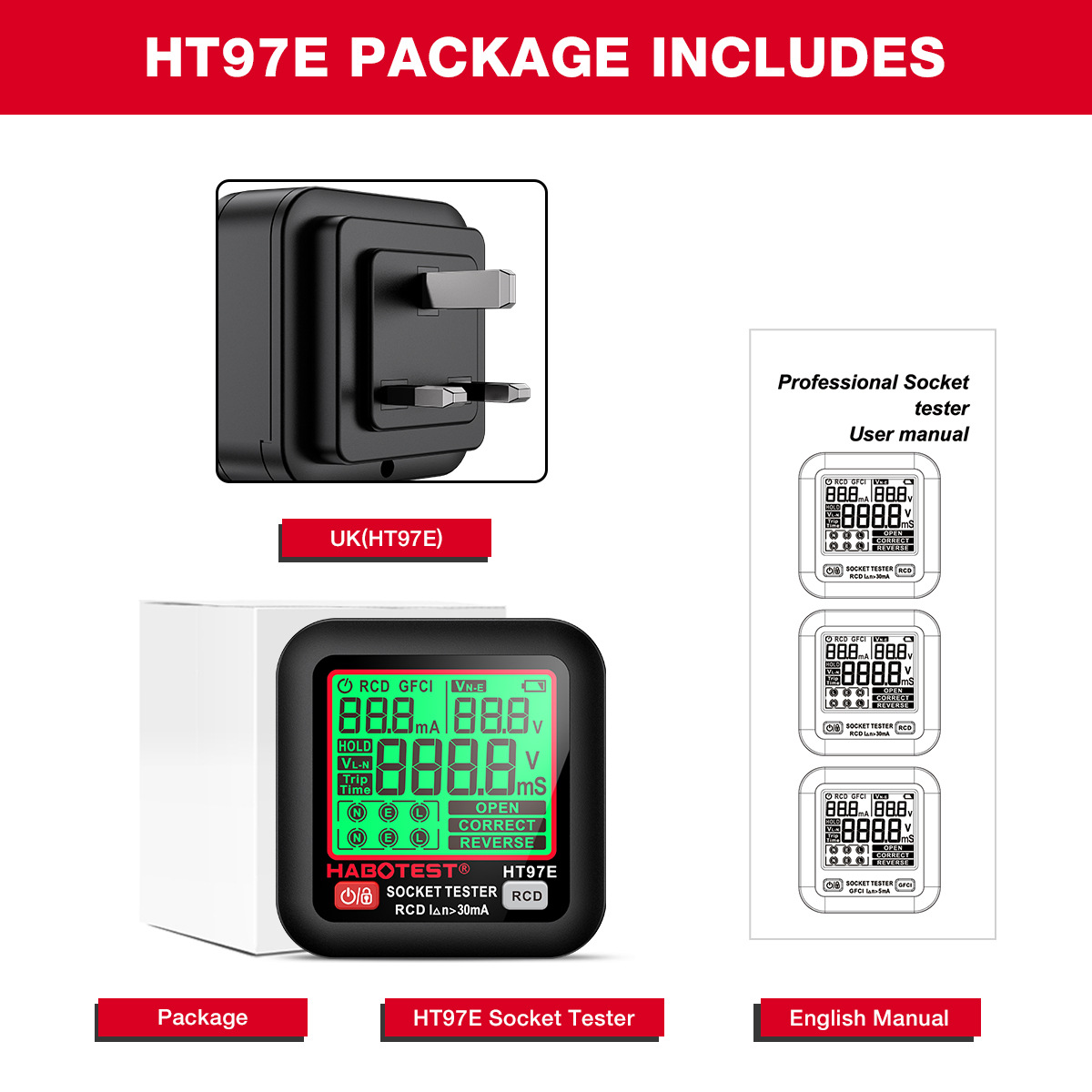 Huabo HT97E & HT97D & HT97B Новый тестер розетки обнаруживает фазовый прибор штекера