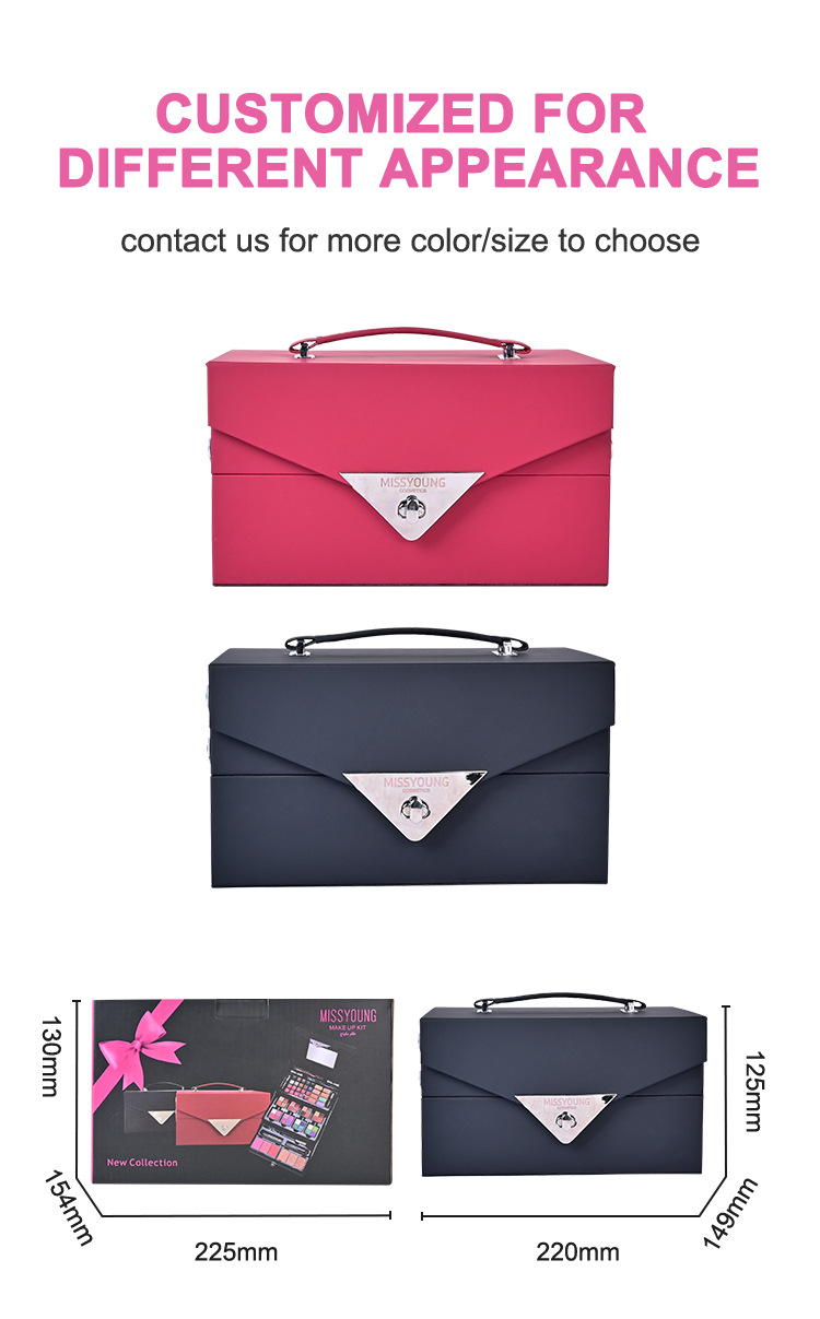 missyoung新品彩妆套装仅用于外贸出口,产品尺寸22*15*12.5cm,重量约1050克,24个一箱,箱规52*48*61cm,毛重27.4千克,净重26.4千克。