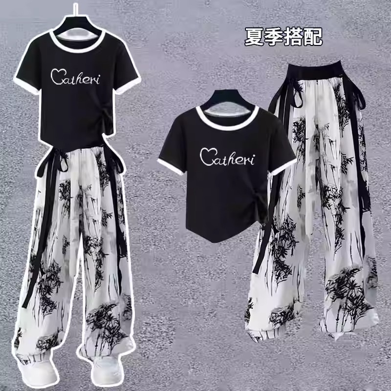 Национальный прилив тонкий летний набор для девочек новый национальный стиль набор новых китайских чернил брюки ретро два комплекта ледяной шелк