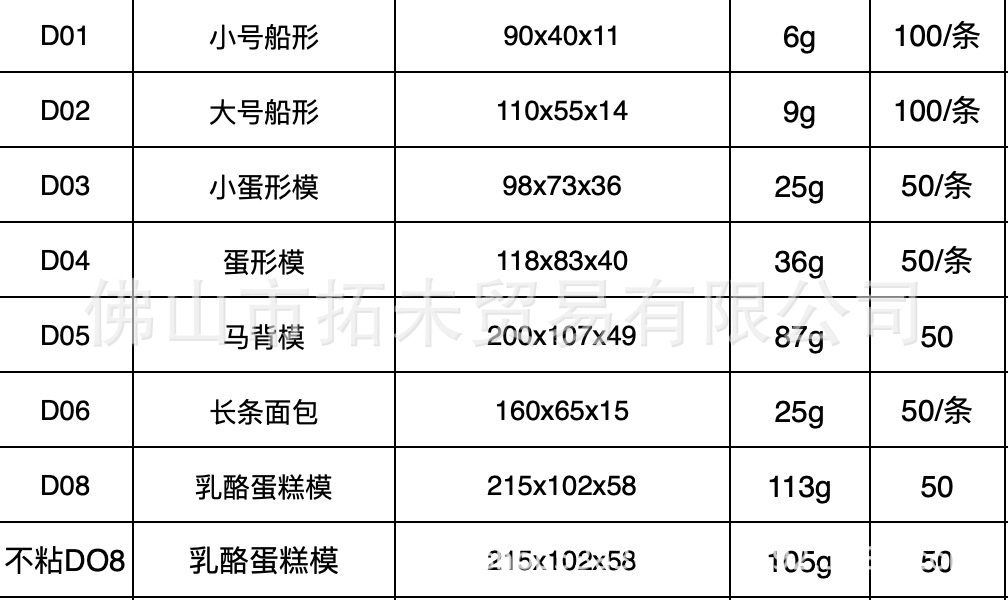 D01 форма небольшого корабля; D02 большая форма корабля; D03 маленькая форма в форме яйца (3 дюйма); Форма в форме яйца D04 (4 дюйма); Форма для спины лошади D05; Длинный хлеб D06; Форма для сырного торта D08 (8 дюймов)