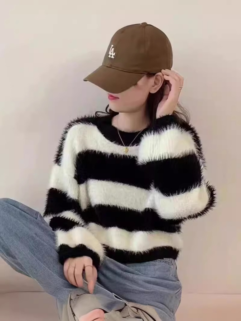 Осенне-зимний свитер из меха норки, толстый и пушистый, вязаный топ из норки с жаккардовым полосатым узором, одежда на заказ.