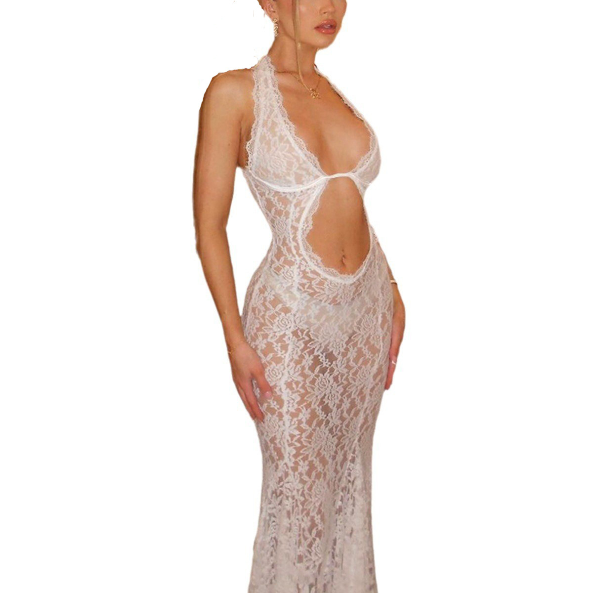 Европейская и американская трансграничная женская одежда 2024 летом новый темперамент кружевное платье с длинной шеей Сексуальное платье без спинки