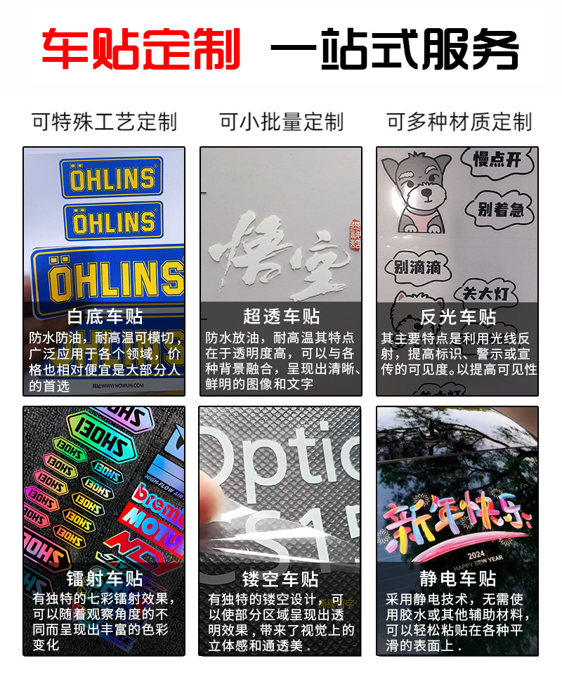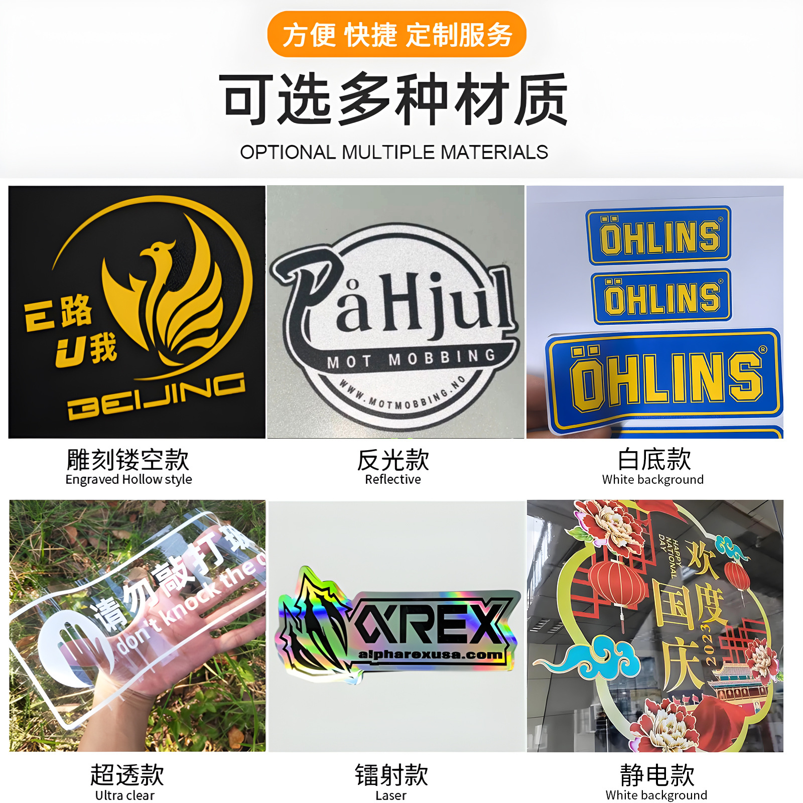 Индивидуальные наклейки; Светоотражающая наклейка; Прозрачная наклейка; Полая наклейка; Светящаяся наклейка; Лазерная наклейка; Магнитные наклейки