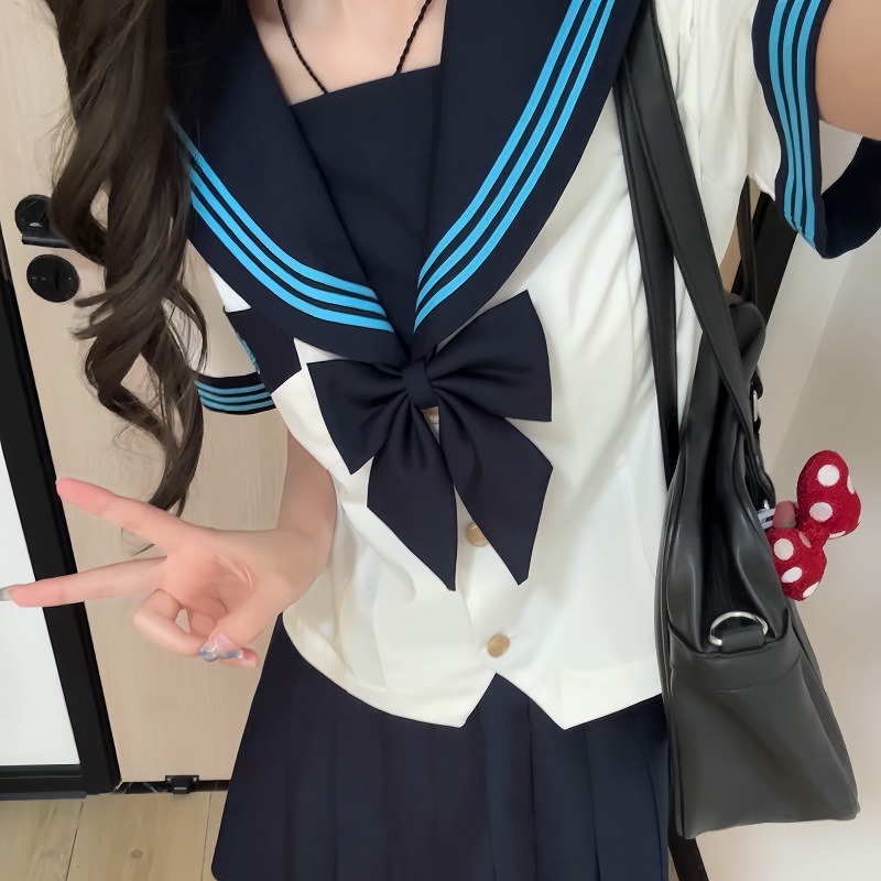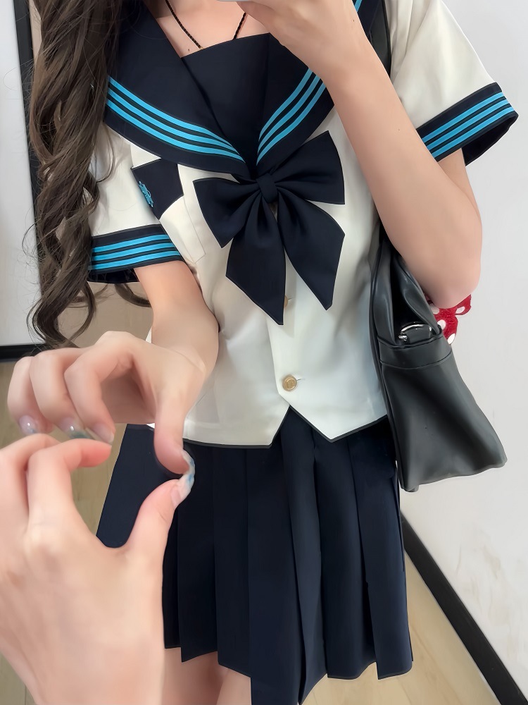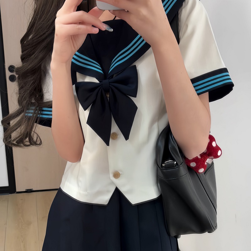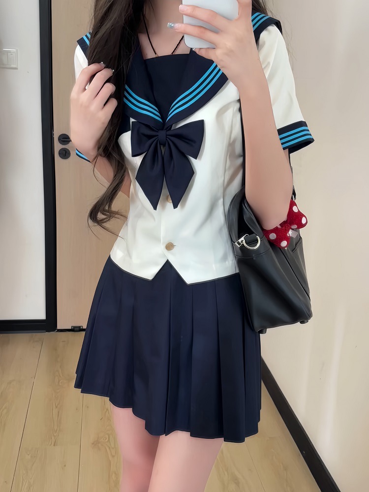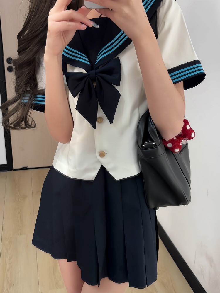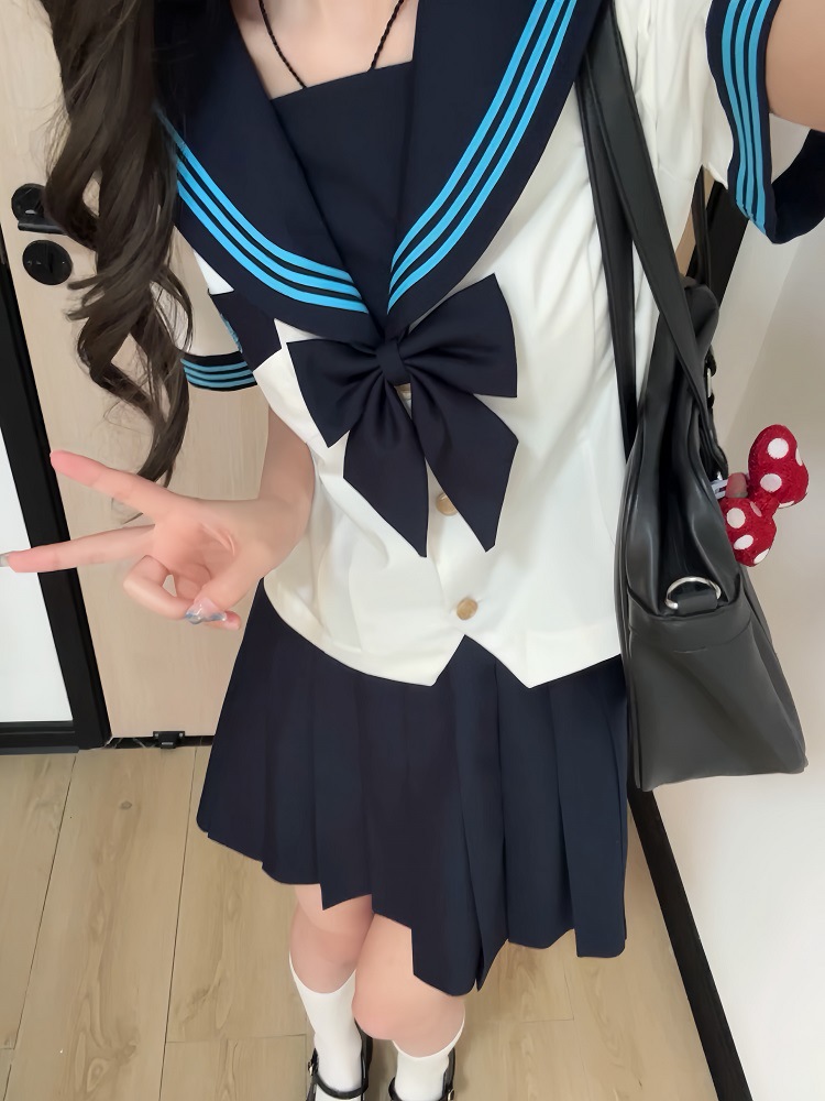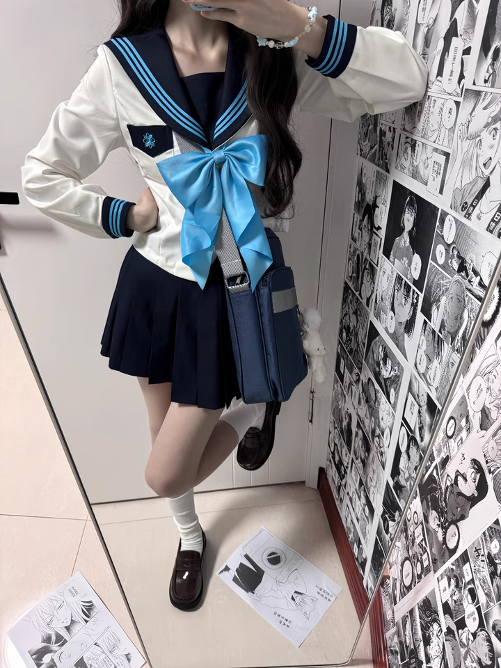 Белый топ с короткими рукавами + голубая юбка 39 см + галстук-бабочка голубого цвета с острым кончиком.; Белый топ с короткими рукавами + голубая юбка 42 см + галстук-бабочка голубого цвета с острым кончиком.; Белый топ с длинными рукавами + голубая юбка 39 см + большой синий галстук-бабочка.; Белый топ с длинными рукавами + синяя юбка 42 см + большой синий галстук-бабочка.; Белый топ с короткими рукавами + синяя юбка 39 см + большой синий галстук-бабочка.; Белый топ с короткими рукавами + синяя юбка 42 см + большой синий галстук-бабочка.