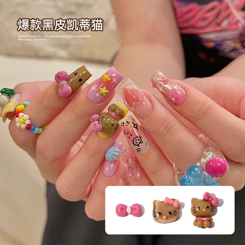 Иу Маникюр Черная кожа Hello Kitty KT Cat Носить ногтевые украшения ins Смола Мини стерео мультфильм Kitty Cat