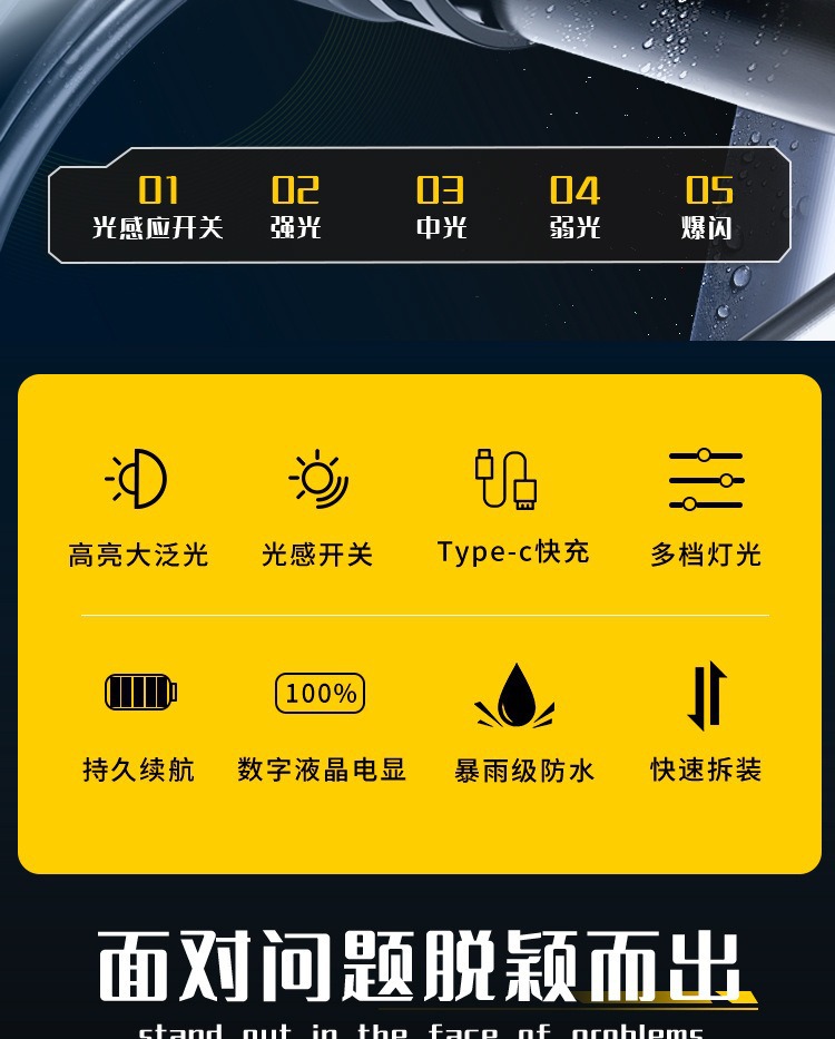 档位 四档:夜间感应(数显处wifi标志亮起)-强光-中光-弱光-快闪