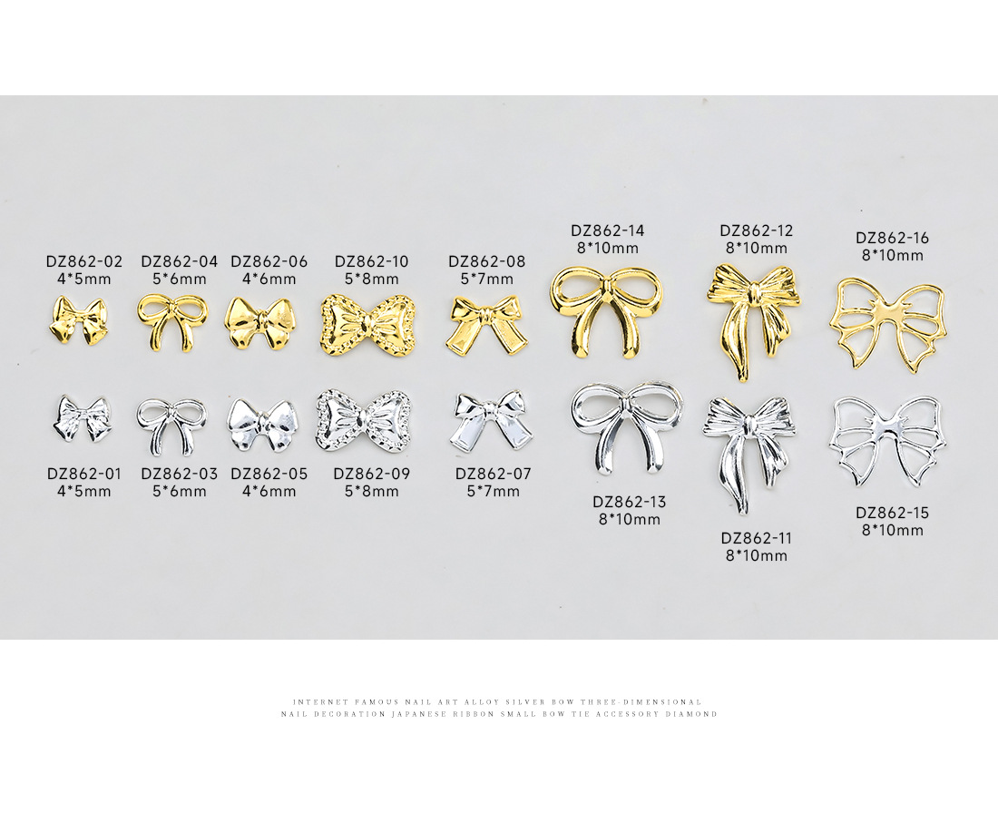 Маленький галстук-бабочка серебристый (DZ862-01); Золотой маленький галстук-бабочка (DZ862-02); Серебряная маленькая полая лента (DZ862-03); Золотая маленькая полая лента (DZ862-04); Галстук-бабочка серебристый средний (DZ862-05); Золотой галстук-бабочка среднего размера (DZ862-06); Серебряный маленький серпантин (DZ862-07); Золотой маленький серпантин (DZ862-08); Большой галстук-бабочка серебристый (DZ862-09); Золотой большой галстук-бабочка (DZ862-10); Серебряный большой серпантин (DZ862-11); Золотой большой серпантин (DZ862-12); Серебряная большая полая лента (DZ862-13); Золотая большая полая лента (DZ862-14); Серебряный полый бант (DZ862-15); Золотой полый бант (DZ862-16)