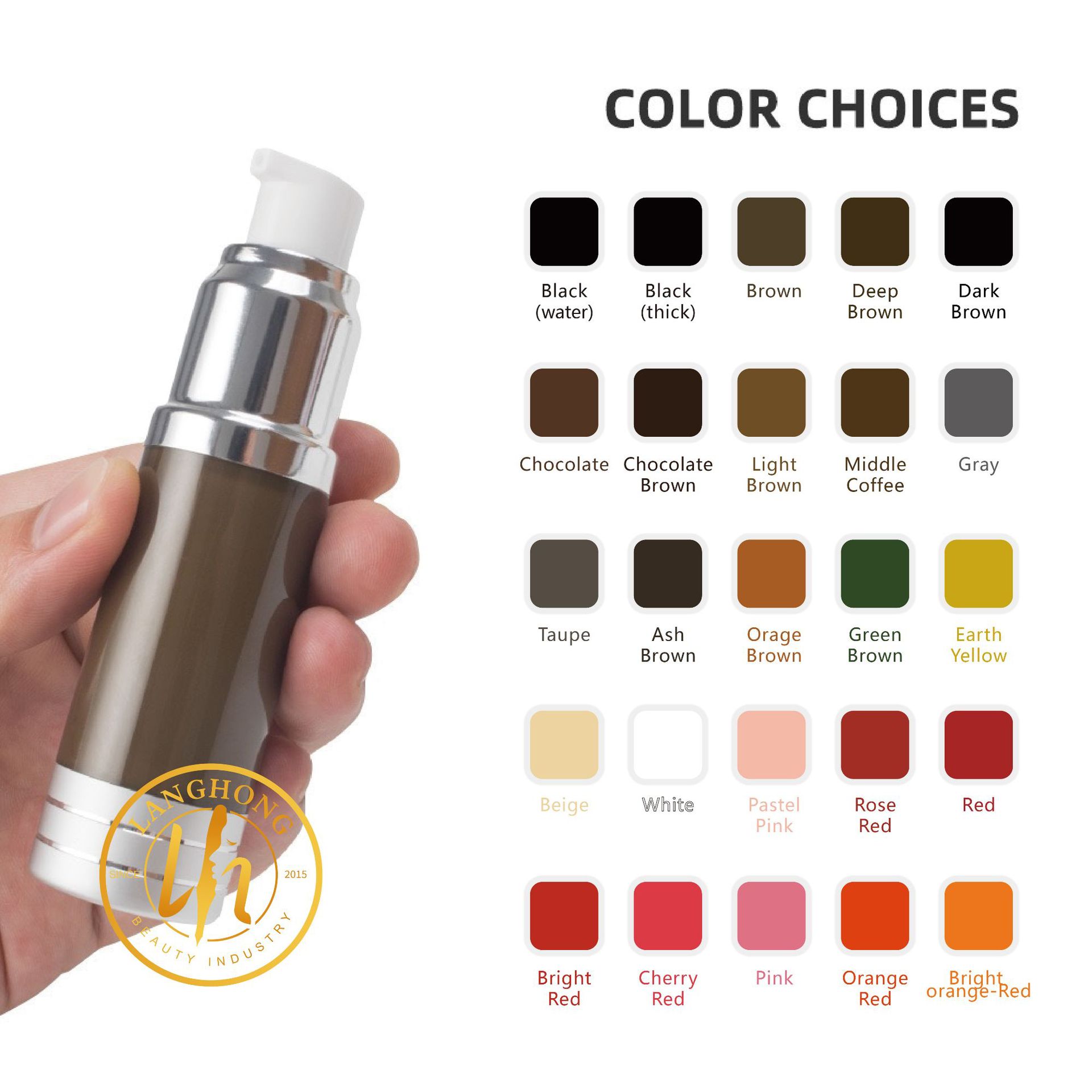 Если вам нужен стиль золотой бутылки, пожалуйста, свяжитесь со службой поддержки клиентов!; Толстый Император Черный-Черный (толстый); 01-Очарование черный-Black (жидкость water); 02-Концентрированный черный-Black (толстый thick); 03-Какао коричневый-Brown (молоко); 04-Глубокий кофе-Deep Brown (молоко); 05-Черный кофе-Dark Brown (молоко); 06-Шоколад-Chocolate (молоко); 07-Черный коричневый-Chocolate Brown (молоко); 08-Коричневый кофе-Light Brown (молоко); 09-Кофе-Middle coffee (молоко); 10-Природный серый-Gray (молоко); 11-Серый кофе-Taupe (молоко); 12-Серый коричневый-Ash Brown (молоко); 13-Оранжевый кофе-Orage Brown (молоко); 14-Зеленый кофе-Green Brown (молоко); 15-Земляне-Earth Yellow (молоко); 16-Цвет кожи-Beige (молоко); 17-Жемчужный белый-White (молоко); 18-Универсальный порошок-Pastel Pink (молоко); 19-Роза красный-Rose red (жидкость); 20-Положительный красный-Red (жидкость); 21-ярко-красный-Bright Red (жидкость); 22-вишневый красный-Cherry red (жидкость); 23-Розовый-Розовый (жидкость); 24-оранжевый красный-Orange Red (жидкость); 25-Яркий оранжевый-Яркий оранжевый (жидкость)