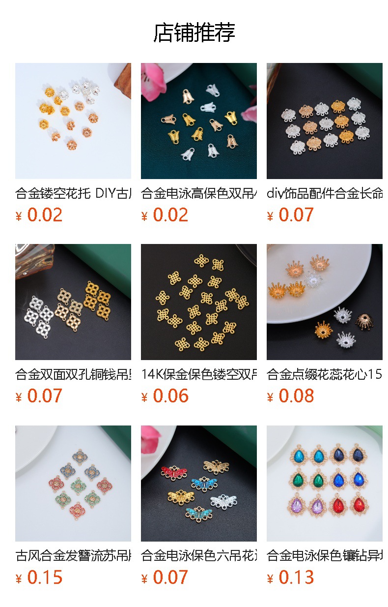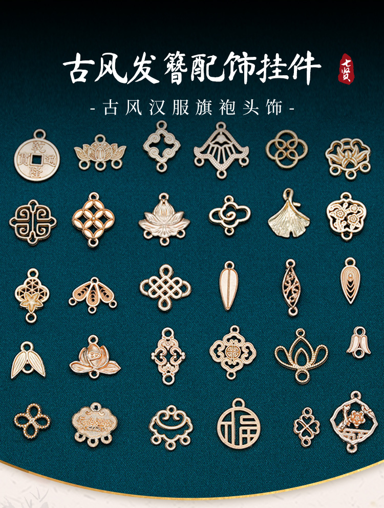 Четыре подвески в виде рыбьего хвоста (100≈116 штук на грамм); Подвеска «Четырехлистный счастливый цветок» со сквозным отверстием (по граммам) 100г≈68 шт.; Многослойные бабочки-бирки в форме веера (100 г ≈ 43 штуки); Просверленные двойные благоприятные облака (по граммам) 100 г≈85 шт.; Мандала-молитвенный круг (по весу) 100 г ≈ 51 штука; Отдельные висячие большие медные монеты (по граммам) 100 г≈138 шт.; Лотос трёхвешалка (по граммам) 100г≈192 шт.; Крест благоприятных облаков (по весу) 100 г ≈ 166 шт.; Четырехотрядный веерообразный (по весу) 100 г ≈ 135 шт.; Тисненый четырехлистный клевер (по граммам) 100г≈263 шт.; Трехподвесный полый замок лотоса (по граммам) 100г≈169 шт.; Тип возврата с четырьмя отверстиями (по граммам) 100 г≈166 шт.; Двойная подвесная имитация медной монеты с четырьмя отверстиями (по граммам) 100 г≈136 шт.; Четырехвисячные бутоны лотоса (по граммам) 100г≈135 шт.; Полый кулон Сяньюнь (по граммам) 100 г≈200 штук; Маленькие листья гинкго, подвешенные по одному (по граммам) 100 г≈181 шт.; Двойные подвесные решетки для окон (100 г≈144 на грамм); Двойная подвесная цветочная корзина в форме пятиконечной звезды (по граммам) 100 г ≈ 178 штук; Четырехвисячный полый клевер (по граммам) 100г≈250 шт.; Китайские узлы (по граммам) 100 г ≈ 120 штук; Однониточные бусины в форме небольших листьев (по весу) 100 г ≈ 294 штуки; Полые скрученные листья (по граммам) 100 г ≈ 344 штуки; Одиночные висячие полые листья (100 г ≈ 384 штук на грамм); Двойные подвесные симметричные маленькие бамбуковые листья (по граммам) 100 г ≈ 303 штуки; Двойной подвесной маленький лотос (по граммам) 100 г≈147 шт.; Двойные подвески в форме сердца (по граммам) 100 г ≈ 212 штук; Фудзи (по граммам) 100 г ≈ 181 штука; Фува (по граммам) 100 г ≈ 66 штук; Подвесная ландыш двойной (по граммам) 100г≈526 шт.; Четыре подвески с подвесками в виде пионов и желаний (по граммам) 100 г≈172 шт.; Двухстворчатые пятивесенние цветочные ветки (по граммам) 100г≈44 шт.; Маленький домик (по граммам) 100г≈55 штук; Двойной подвесной знак на окно в виде цветка сливы (по граммам) 100 г≈35 шт.; Кепка из полой сетки (по граммам) 100 г≈89 шт.; Двойной подвесной ангелок с цветком (по граммам) 100 г ≈ 37 штук; Полый восьмиколосный лотос (по граммам) 100 г ≈ 49 штук; Двойные висячие овальные листья лотоса (по граммам) 100 г ≈ 38 штук; Ручной лунный кристалл (по граммам) 100 г ≈ 53 штуки; Двусторонний ромб с тремя крючками (по граммам) 100 г ≈ 109 штук; Полая тыква с цветками и листьями (по граммам) 100 г≈62 шт.; Веер из четырех бриллиантов из листьев бамбука (по граммам) 100 г≈68 шт.; Пористый экзотический замок (по граммам) 100 г ≈ 33 штуки; Двусторонний банановый лотос (100 г ≈ 41 штука на грамм); Четырехподвесные пористые полые подвески-гирлянды (по граммам) 100г≈78 шт.; Четыре подвески в форме симметричного сердца (по граммам) 100 г ≈ 54 штуки; Шесть подвесных маленьких цветочных кругов (по граммам) 100 г ≈ 46 штук; Четырехподвесное полое круглое кольцо (по граммам) 100 г≈42 шт.; Полый искусственный шелк лотос (по граммам) 100г≈75 шт.; Трёхвёздчатый цветок (по граммам) 100 г ≈ 49 штук; Подвески с десятью отверстиями (по весу) 100 г ≈ 106 штук; Экзотические раковины из драгоценных камней (по граммам) 100 г≈61 шт.; Двойной подвесной оконный цветок с одним сливовым цветком (по граммам) 100 г≈136 шт.; Двойной подвесной маленький четырехлистный клевер (по граммам) 100 г ≈ 416 штук; Одиночная подвесная полая карта с надписью (по граммам) 100 г≈129 шт.; Тег Ruyi (по граммам) 100 г ≈ 238 штук; Четыре 