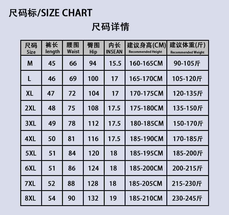 M; L; XL; XXL; XXXL; 4XL; 5XL; 6XL; 7XL; 8XL