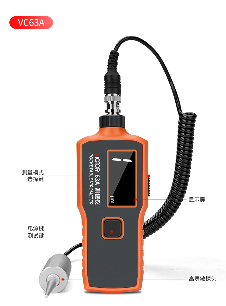 VC63 [Смещение/скорость/ускорение] (зонд «все в одном»); VC63A [Смещение/скорость] (разделенный заостренный зонд); VC63B [Смещение/скорость/ускорение] (разделенный магнитный датчик всасывания); VC63D [Смещение/скорость/ускорение/связь с ПК] (разделенный магнитный датчик всасывания); VC63E [Смещение/скорость/ускорение/связь с ПК] (разделенный заостренный зонд); VC63K [Смещение/скорость/ускорение/частота] (разделенный магнитный датчик); VC65 высокочастотная модель [смещение/скорость/ускорение] (все в одном зонд); VC65B Высокая частота [смещение/скорость/ускорение] (сплит-заостренный зонд); VC66B Высокая частота [смещение/скорость/ускорение] (разделенный магнитный датчик всасывания)