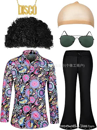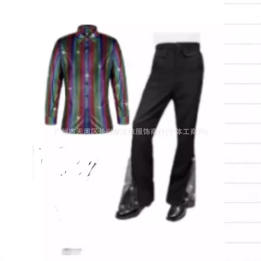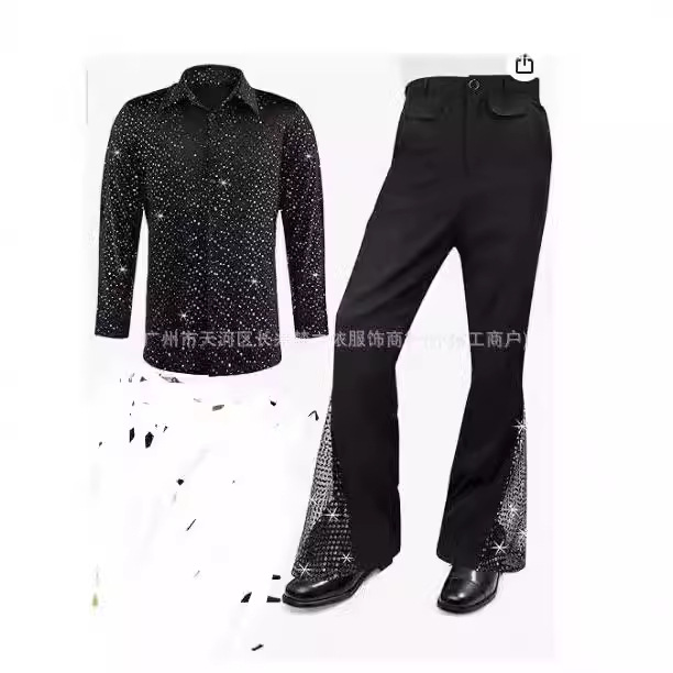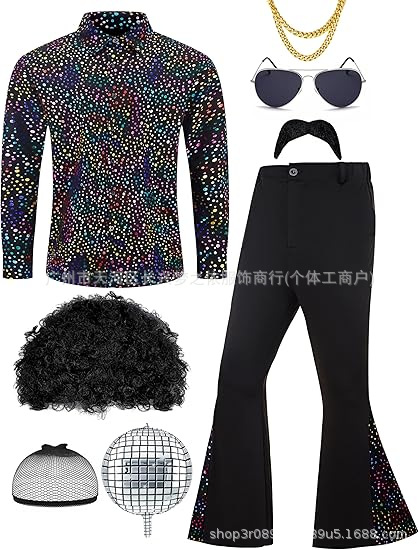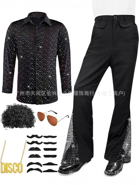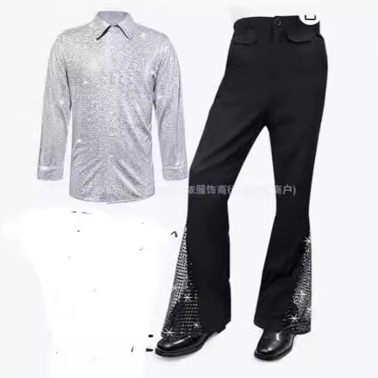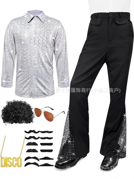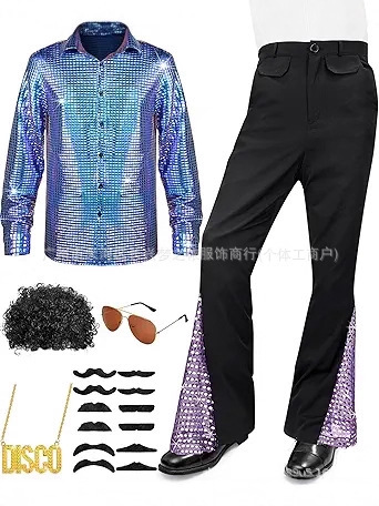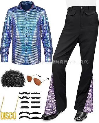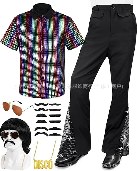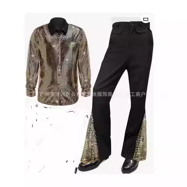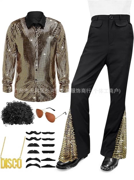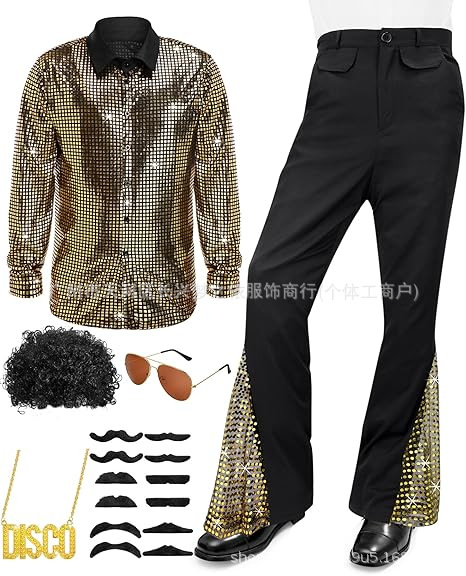 Amazon Мужская диско-одежда 70-х годов Брюки-клеш с блестками Брюки Бронзовая рубашка с блестками