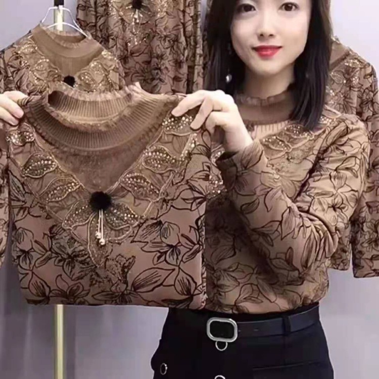 Женская утепленная базовая футболка на флисе, осень-зима 2025, с длинным рукавом, омолаживающий кружевной воротник, стройнящая, скрывающая живот, модная одежда для мам.