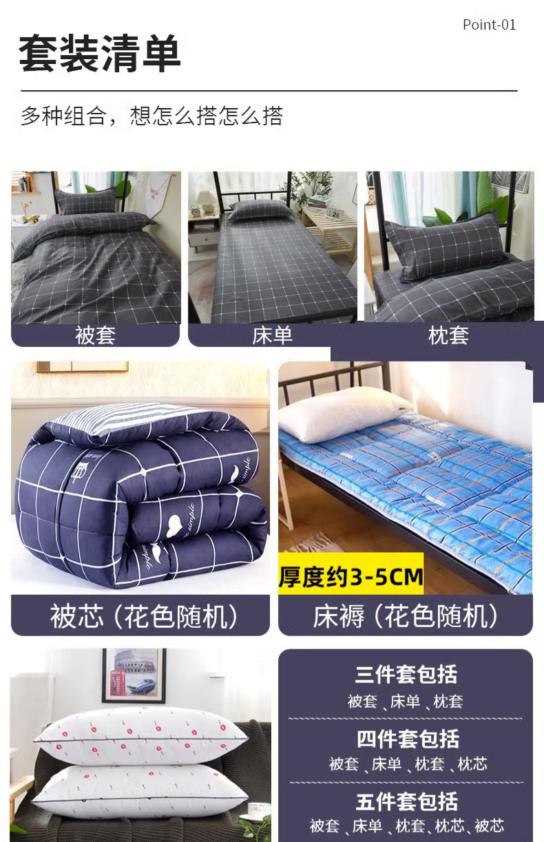 Комплект для общежития из трех предметов [простыни + пододеяльник 1,5*2,0 + наволочка]; Комплект постельных простыней из четырех предметов 1,5*2, пододеяльник + простыни + 2 наволочки; Комплект постельных простыней из четырех предметов 1,8*2,2 пододеяльника + простыни + 2 наволочки; Комплект постельных простыней из четырех предметов 2.0*2,3 пододеяльник + простыни + 2 наволочки; Комплект общежития из четырех предметов [доставка 1 сердцевиной подушки]; Комплект для общежития из пяти предметов [с одеялом 3 фунта + сердцевиной подушки]; Комплект для общежития из пяти предметов [с одеялом 4 фунта + сердцевиной подушки]; Комплект для общежития из пяти предметов [с одеялом на 5 фунтов + сердцевиной подушки]; Комплект для общежития из пяти предметов [с одеялом 6 фунтов + сердцевиной подушки]; Комплект для общежития из пяти предметов [с одеялом на 7 фунтов + сердцевиной подушки]; Комплект постельного белья 0,9/шесть предметов [3 фунта одеяла + матрас + сердцевина подушки]; Комплект постельного белья 0,9/шесть предметов [одеяло 4 фунта + матрас + сердцевина подушки]; Комплект постельного белья 0,9/шесть предметов [одеяло 5 фунтов + матрас + наполнитель подушки]; Комплект постельного белья 0,9/шесть предметов [одеяло 6 фунтов + матрас + сердцевина подушки]; Комплект постельного белья 0,9/шесть предметов [ковдра на 7 фунтов + матрас + наполнитель подушки]; Комплект постельного белья 1,2 из шести предметов: одеяло 3 фунта + матрас + сердцевина подушки]; Комплект постельного белья 1,2 из шести предметов [одеяло 4 фунта + матрас + сердцевина подушки]; Комплект постельного белья 1,2 из шести предметов [одеяло 5 фунтов + матрас + сердцевина подушки]; Комплект постельного белья 1,2 из шести предметов [одеяло 6 фунтов + матрас + сердцевина подушки]; Комплект постельного белья 1,2 из шести предметов [ковдра на 7 фунтов + матрас + сердцевина подушки]