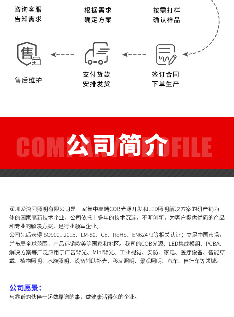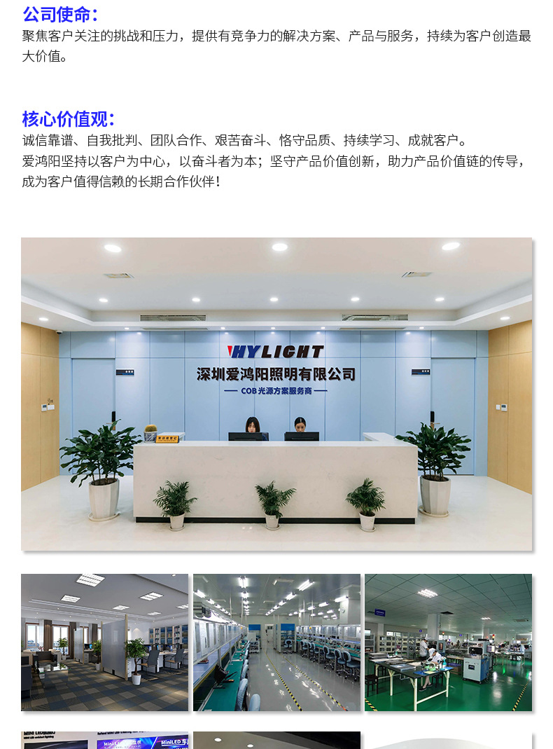 深圳爱鸿阳照明有限公司是一家专注于 COB LED 光源、LED 模组及其应用解决方案的研产销为一体的高新技术企业。公司依托十多年的技术沉淀,不断创新,为客户提供优质的解决方案和专业的产品,是行业领军企业。