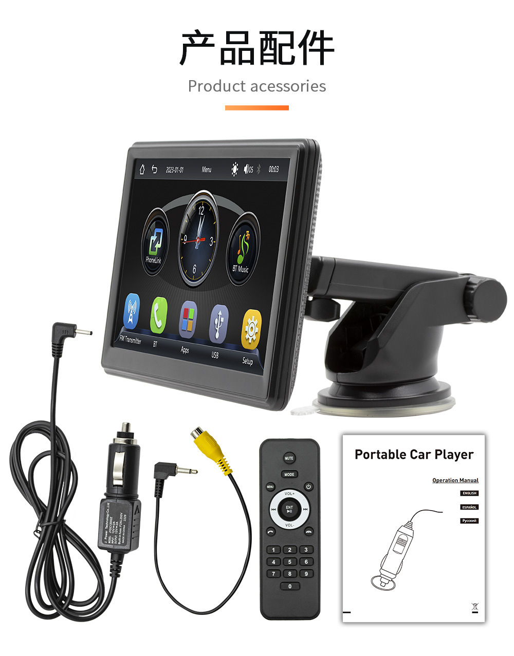 *产品配件:1.主机 2.说明书 3.点烟器电源线 4.吸盘支架 5. 21键硅胶遥控器 6.倒车视频线(配件、说明书、包装会不定时更新,以实际收到货为准)