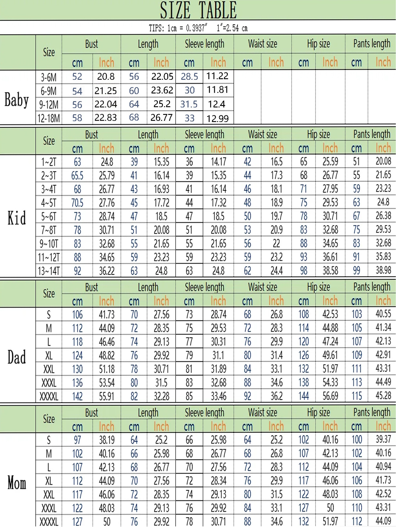 Папа S; Папа M; Папа Л.; Папа XL; Папа 2XL; Папа 3XL; Папа 4XL; Мама S; Мама M; Мама L; Мама XL; Мама 2XL; Мама 3XL; Мама 4XL; Малыш 6; Малыш 9; Малыш 12; Малыш 18; Ребенок 2; Ребенок 3; Ребенок 4; Ребенок 5; Ребенок 6; Ребенок 8; Ребенок 10; Ребенок 12; Ребенок 14; Собака S; Собака М; Собака L; Собака XL