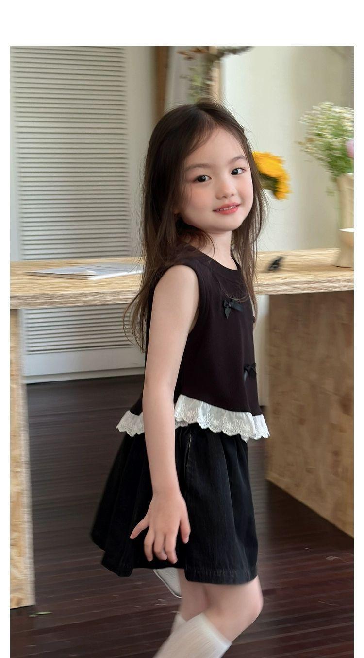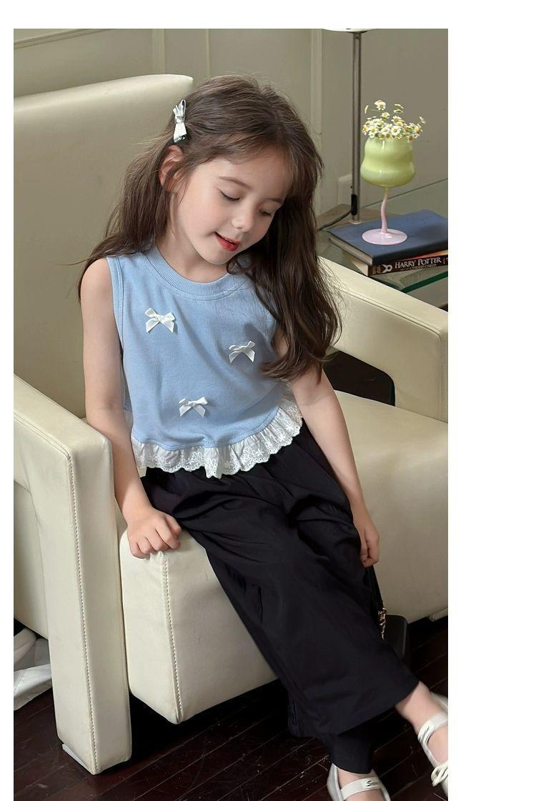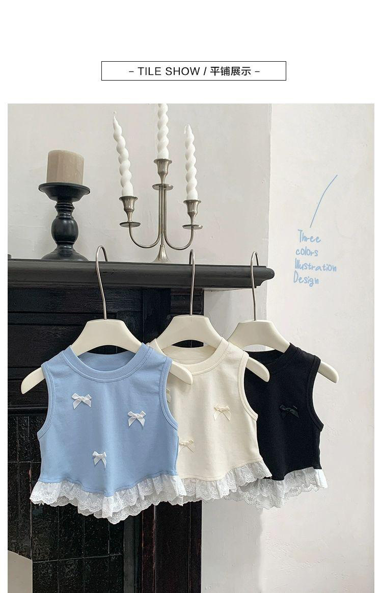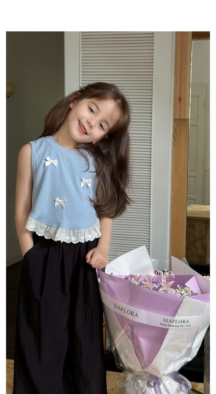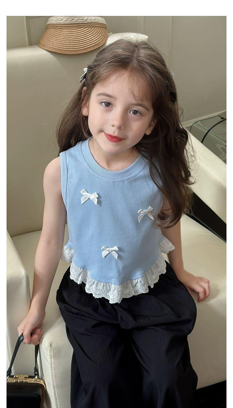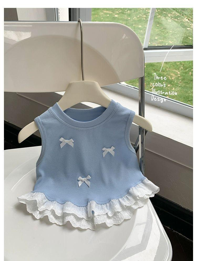 Короткий жилет для девочек с бантом 2024 летом новый иностранный ребенок кружевной кружевной сшитый топ без рукавов