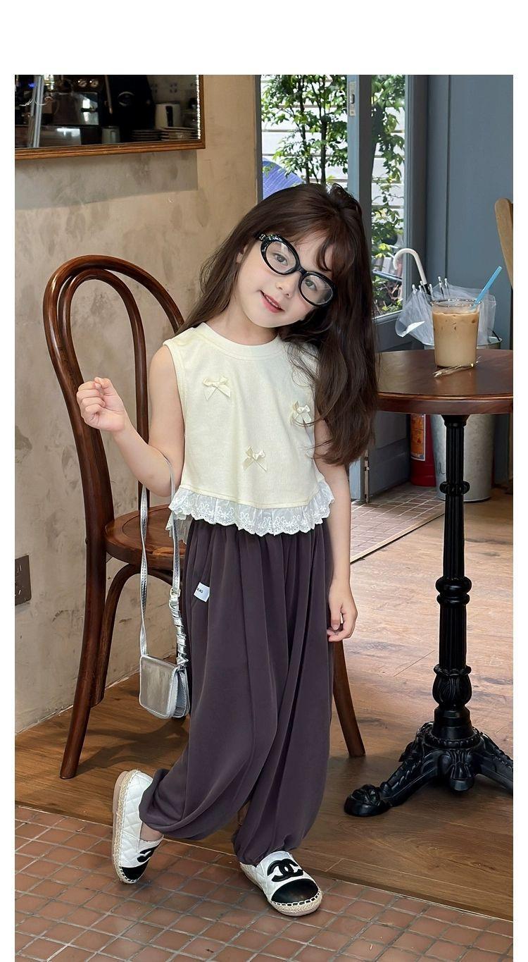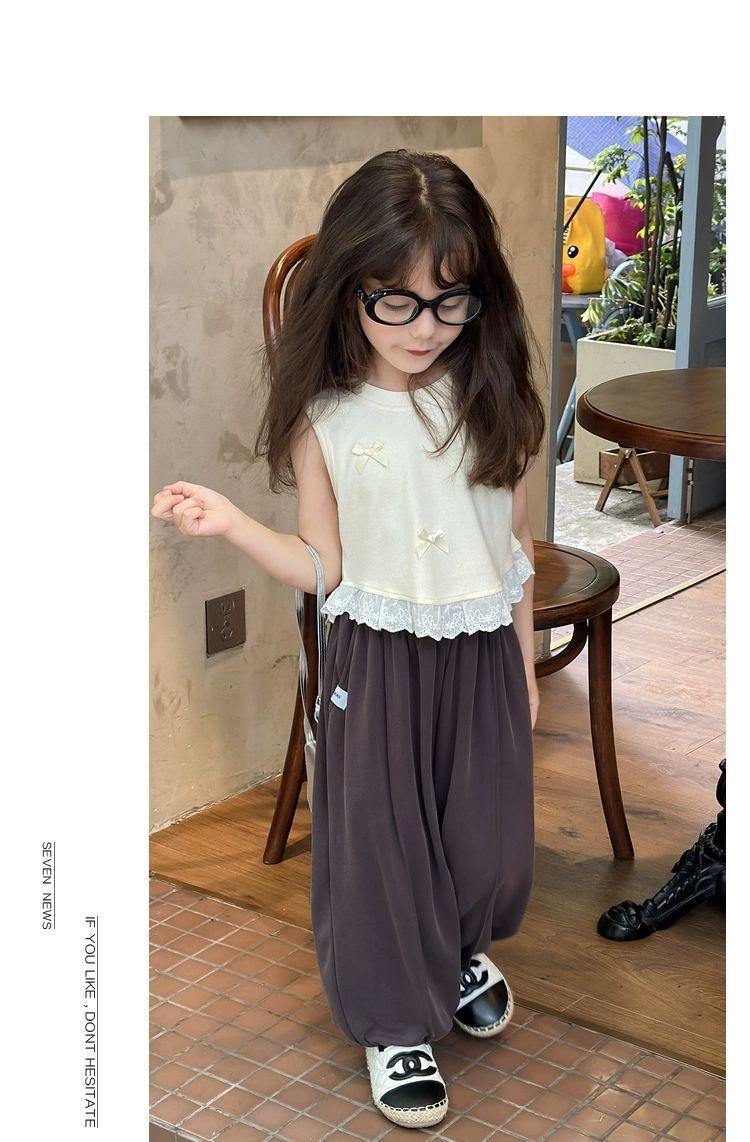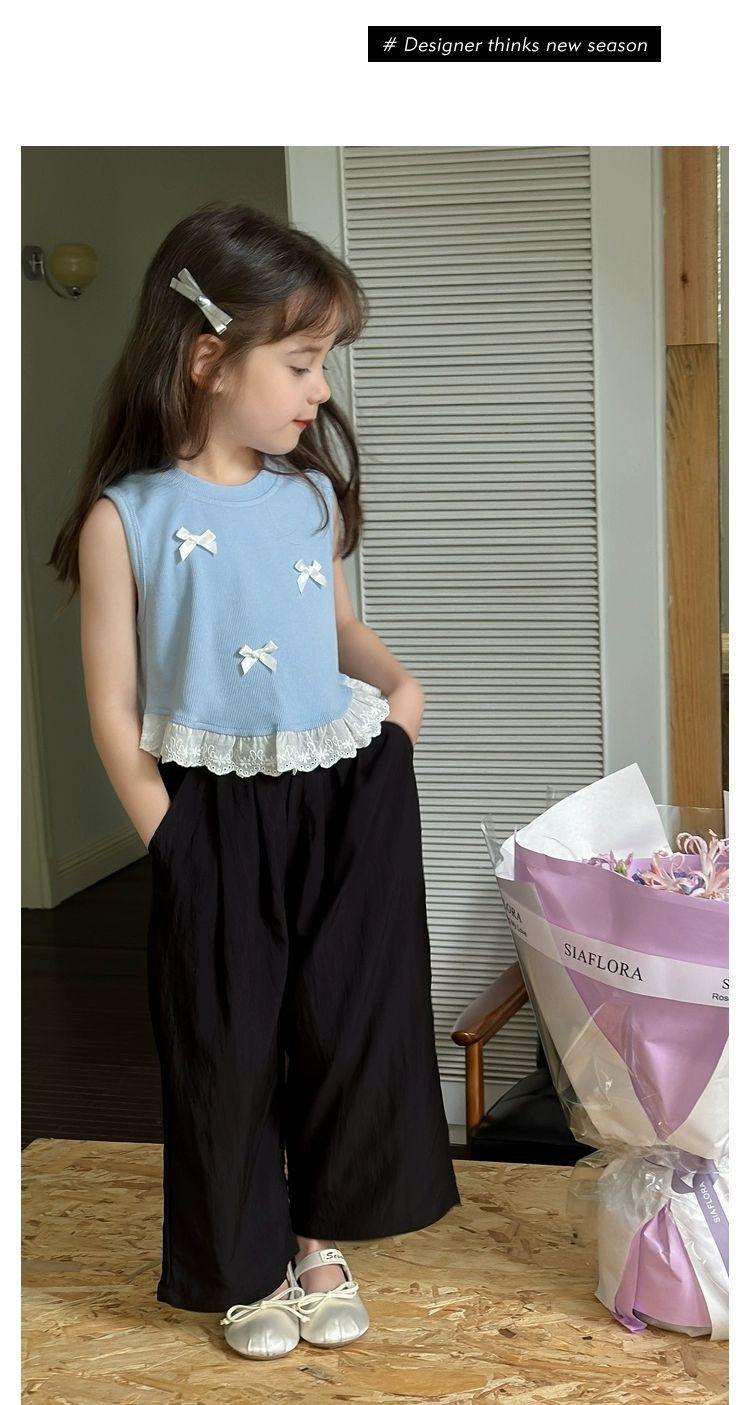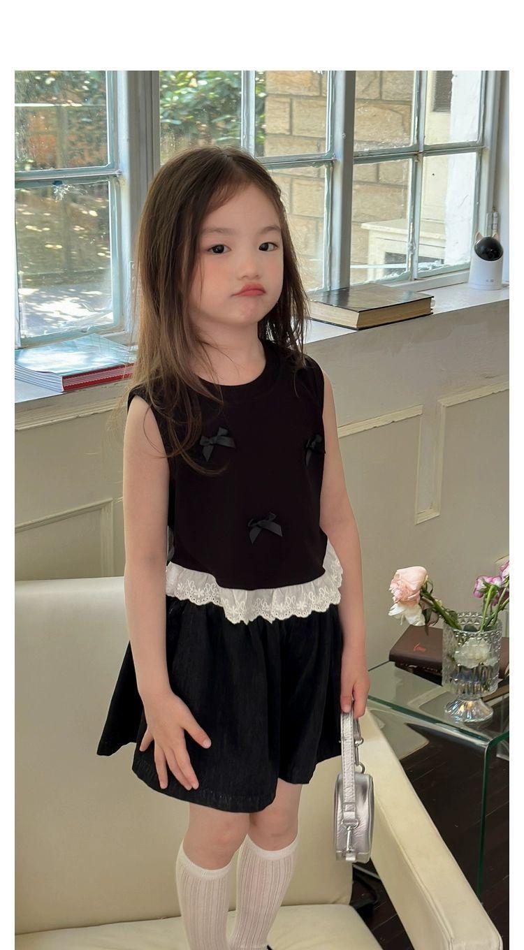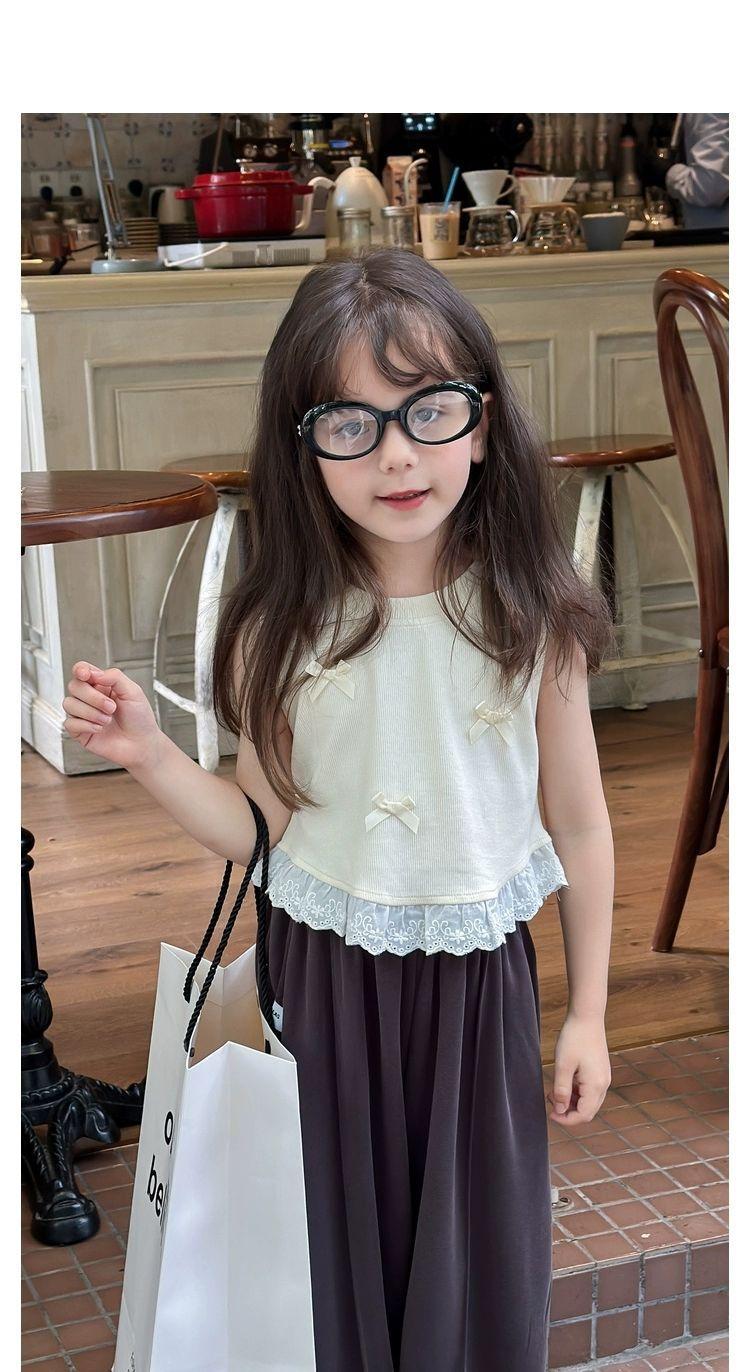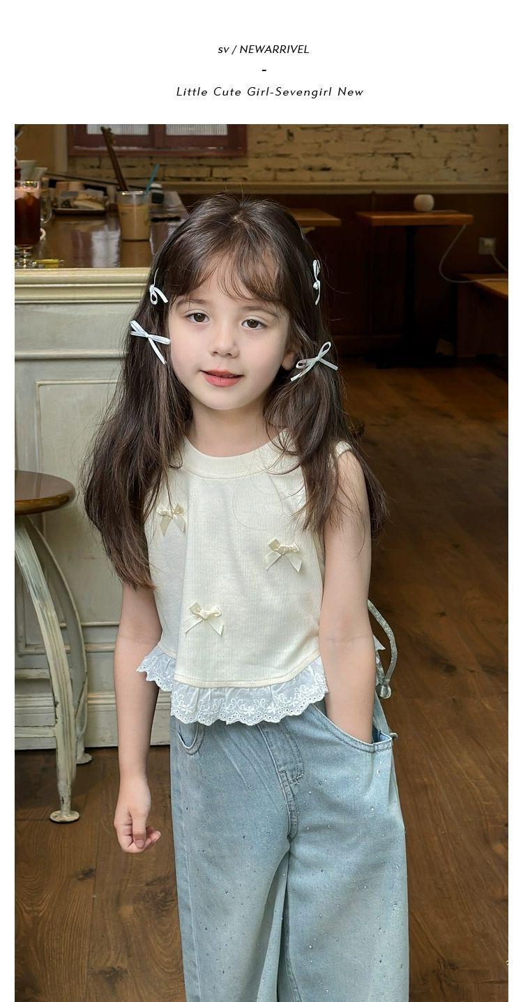 Короткий жилет для девочек с бантом 2024 летом новый иностранный ребенок кружевной кружевной сшитый топ без рукавов