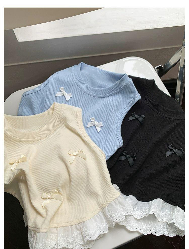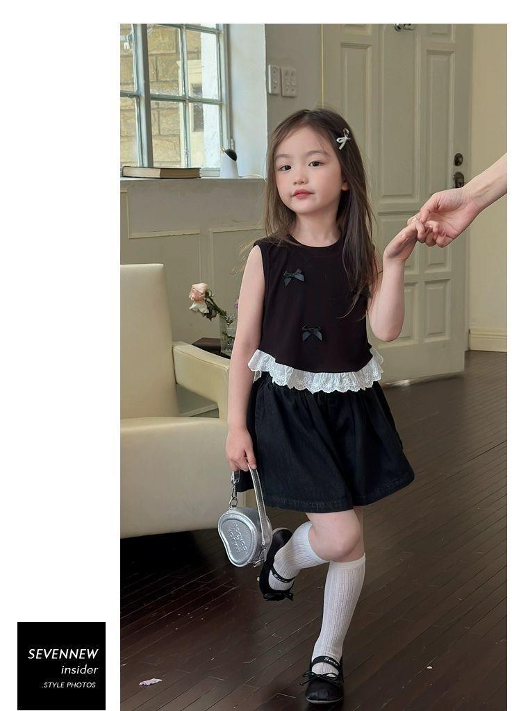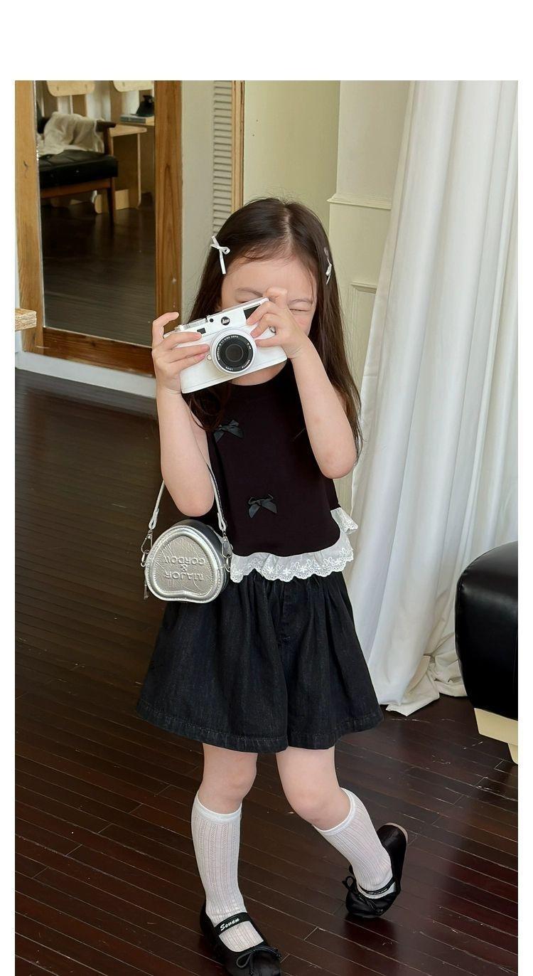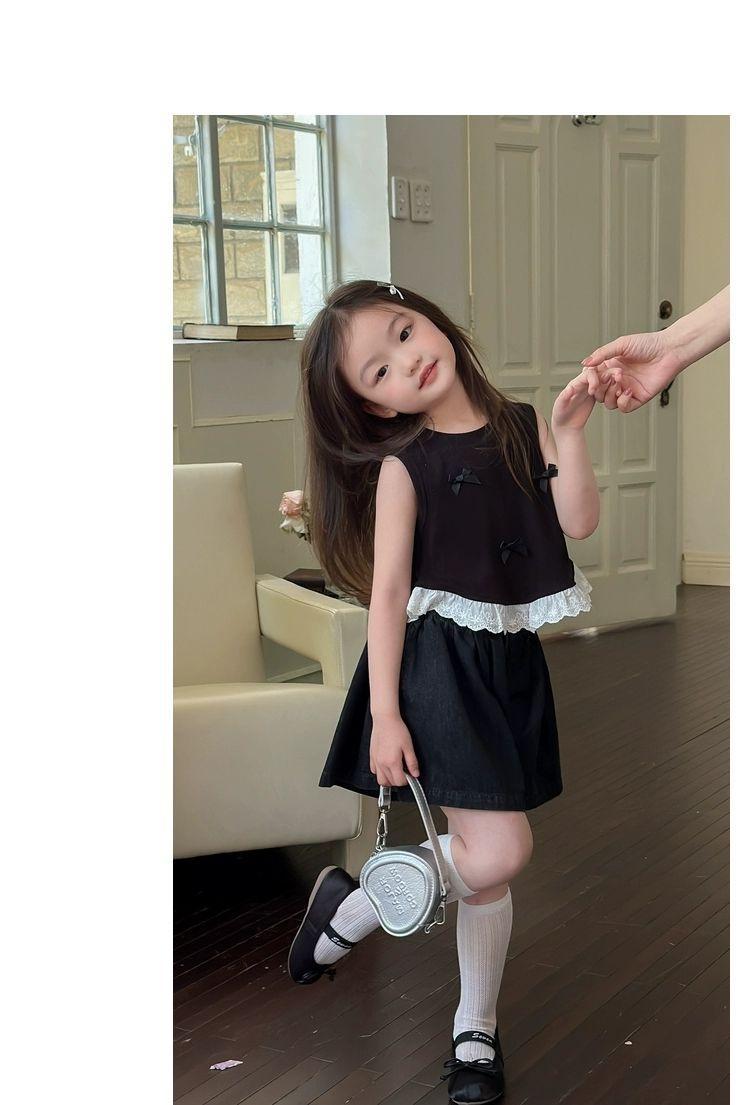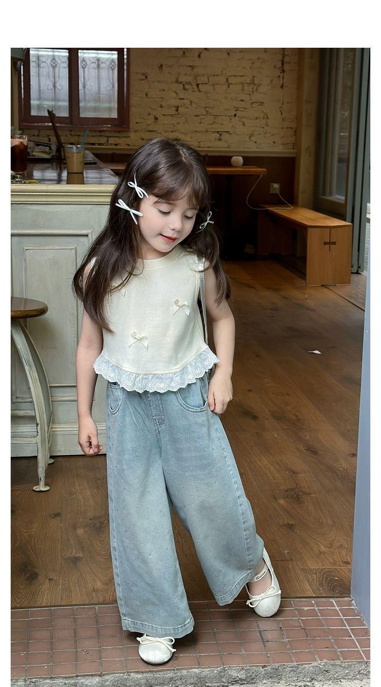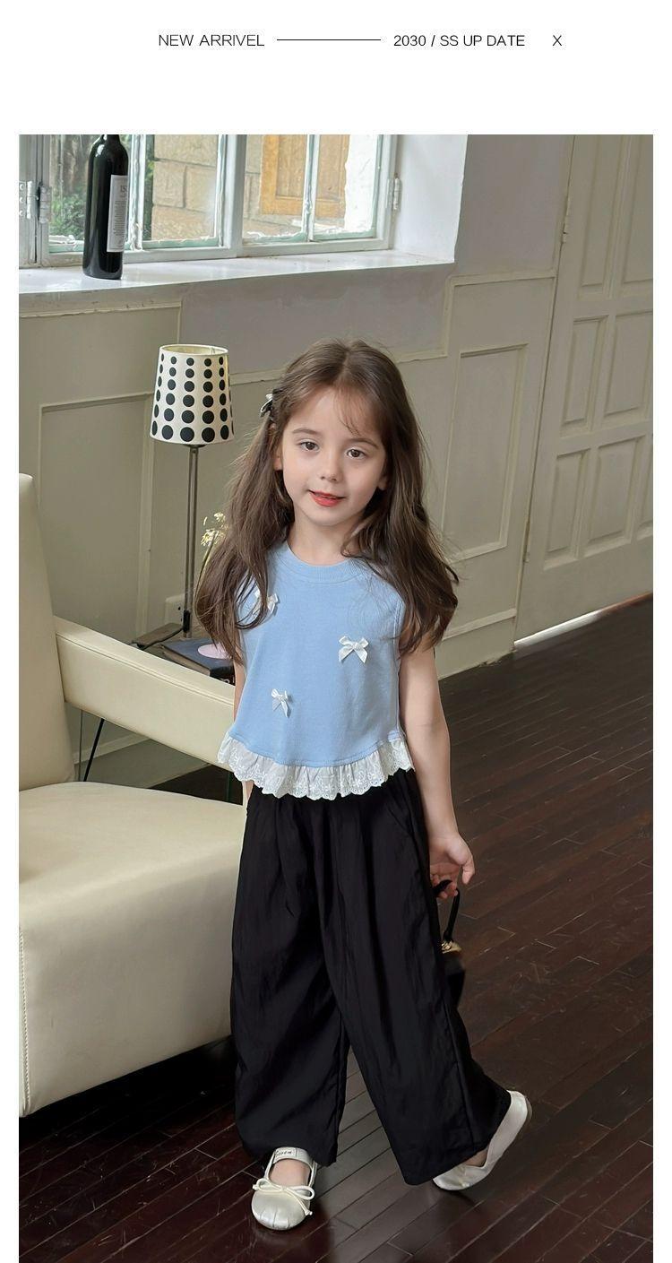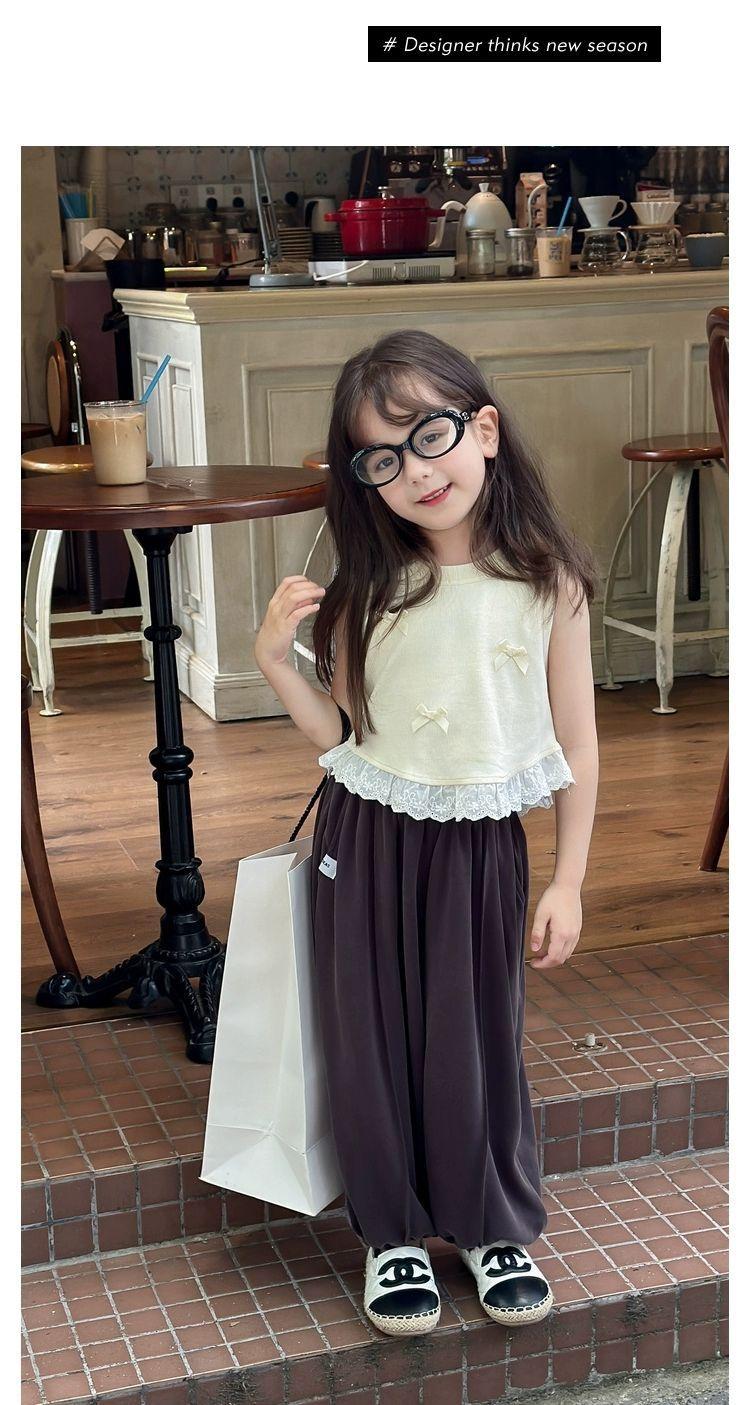 Короткий жилет для девочек с бантом 2024 летом новый иностранный ребенок кружевной кружевной сшитый топ без рукавов