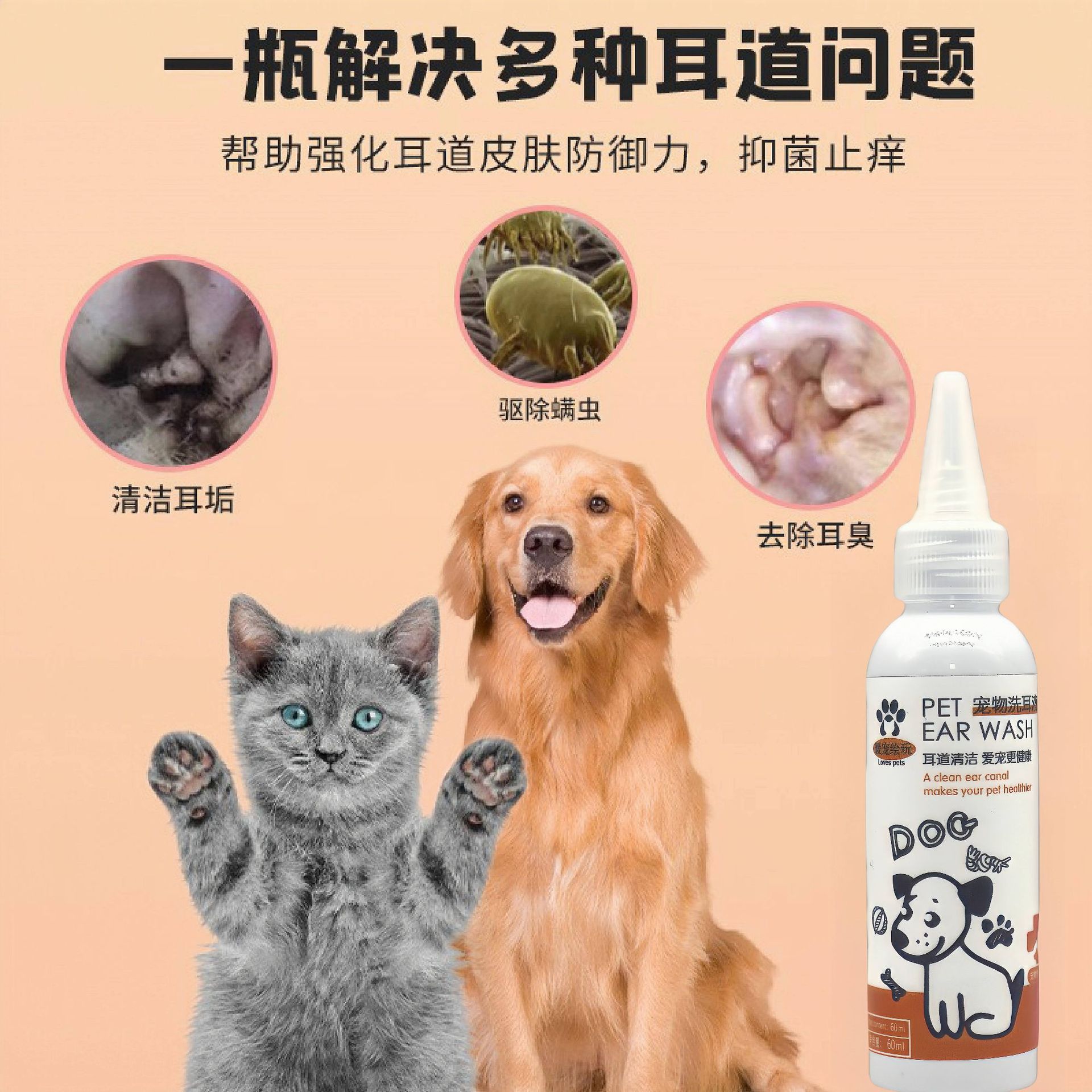 Ушная жидкость для домашних животных Кошка собака удаляет ушных клещей