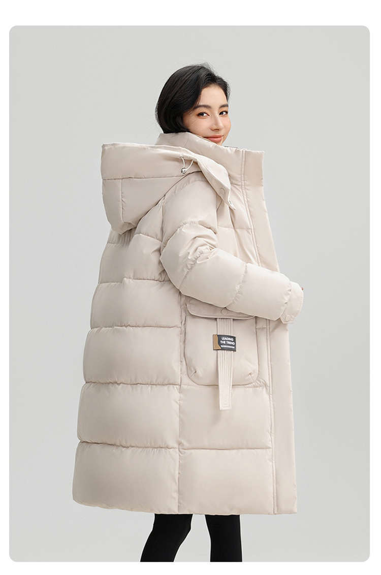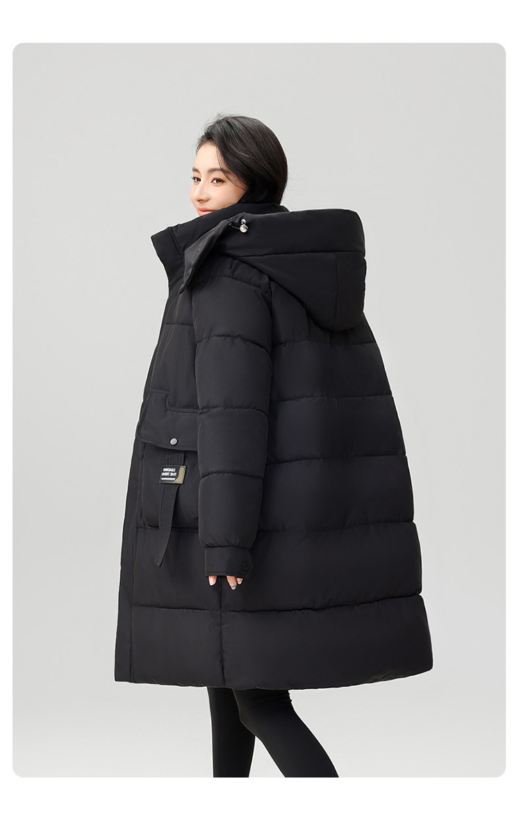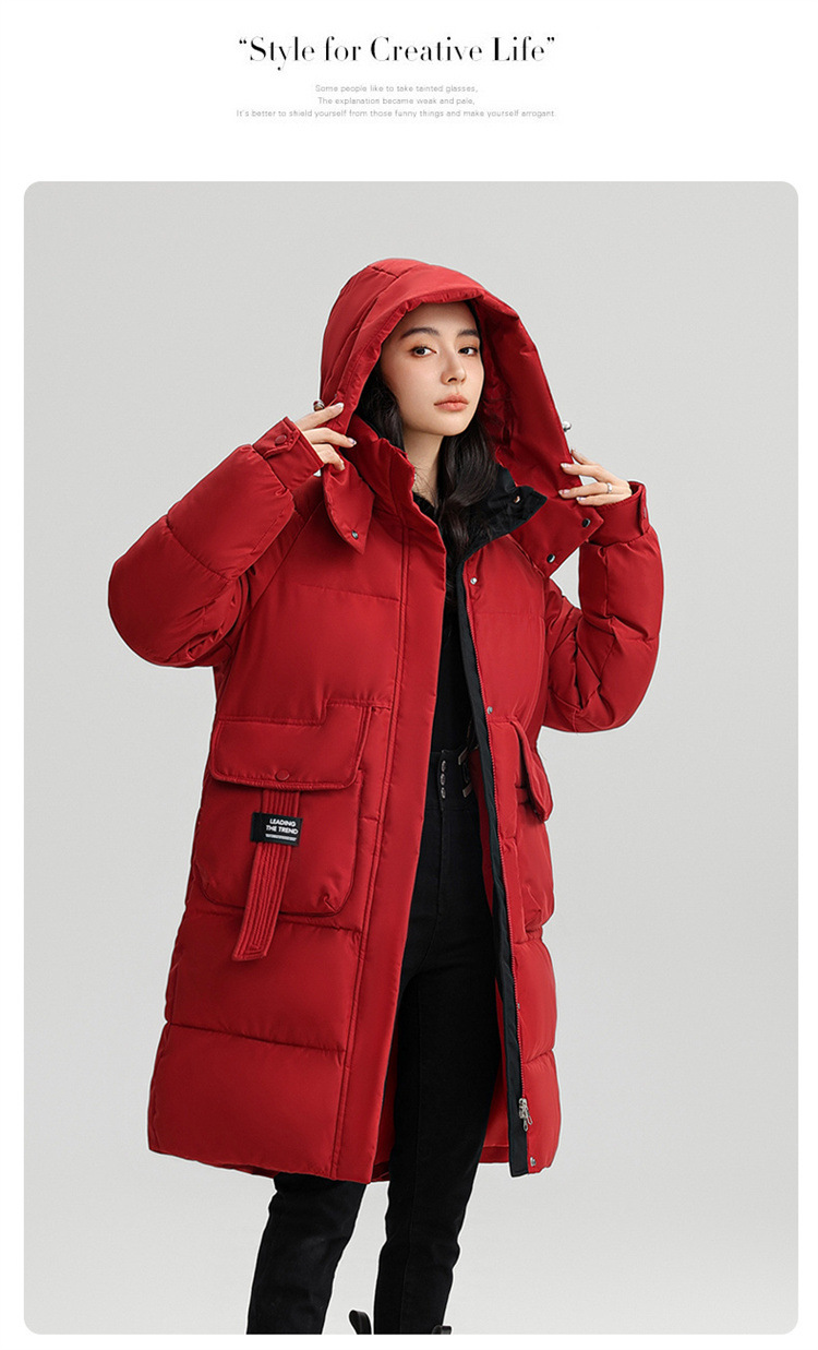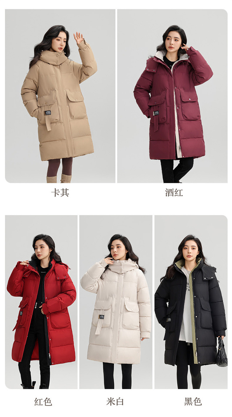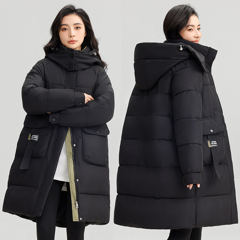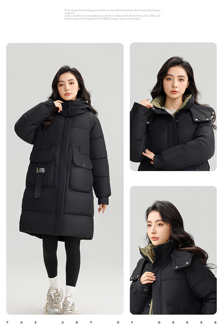 Большой карман средняя длинная хлопчатобумажная одежда женщина 2024 зима новая корейская версия с капюшоном утолщенная и теплая студенческая ебная одежда