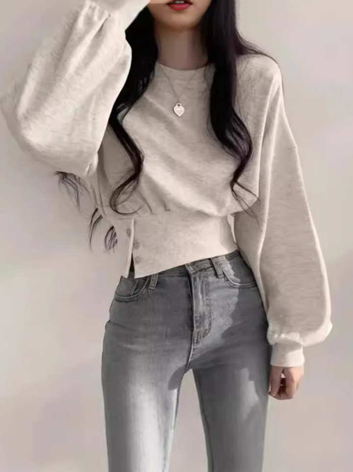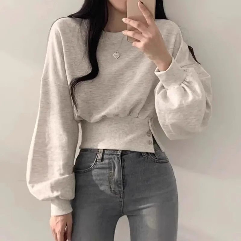Корейский чик осень нишевые дизайнерские ощущения с круглым вырезом и тонкая талия с длинными рукавами