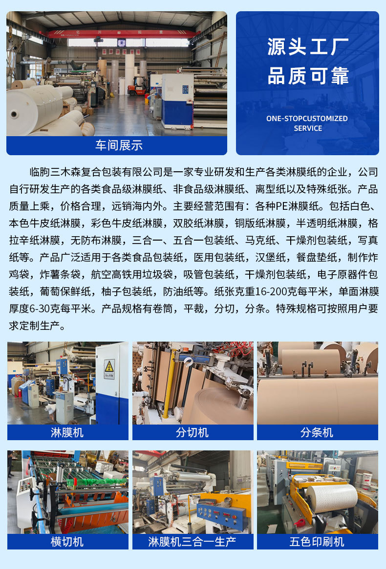 各种PE淋膜纸,包括白色、本色牛皮纸淋膜,彩色牛皮纸淋膜,双胶纸淋膜,铜版纸淋膜,半透明纸淋膜,格拉辛纸淋膜,无防布淋膜,三合一、五合一包装纸、马克纸、干燥剂包装纸,写真纸等。
