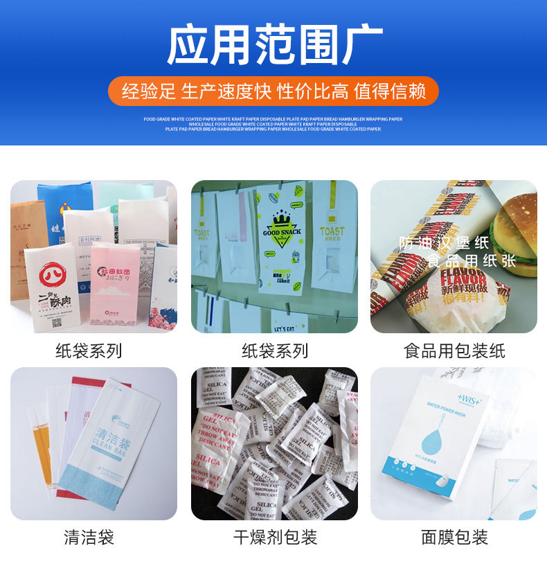 各类食品包装纸,医用包装纸,汉堡纸,餐盘垫纸,制作炸鸡袋,炸薯条袋,航空高铁用垃圾袋,吸管包装纸,干燥剂包装纸,电子原器件包装纸,葡萄保鲜纸,柚子包装纸,防油纸等。