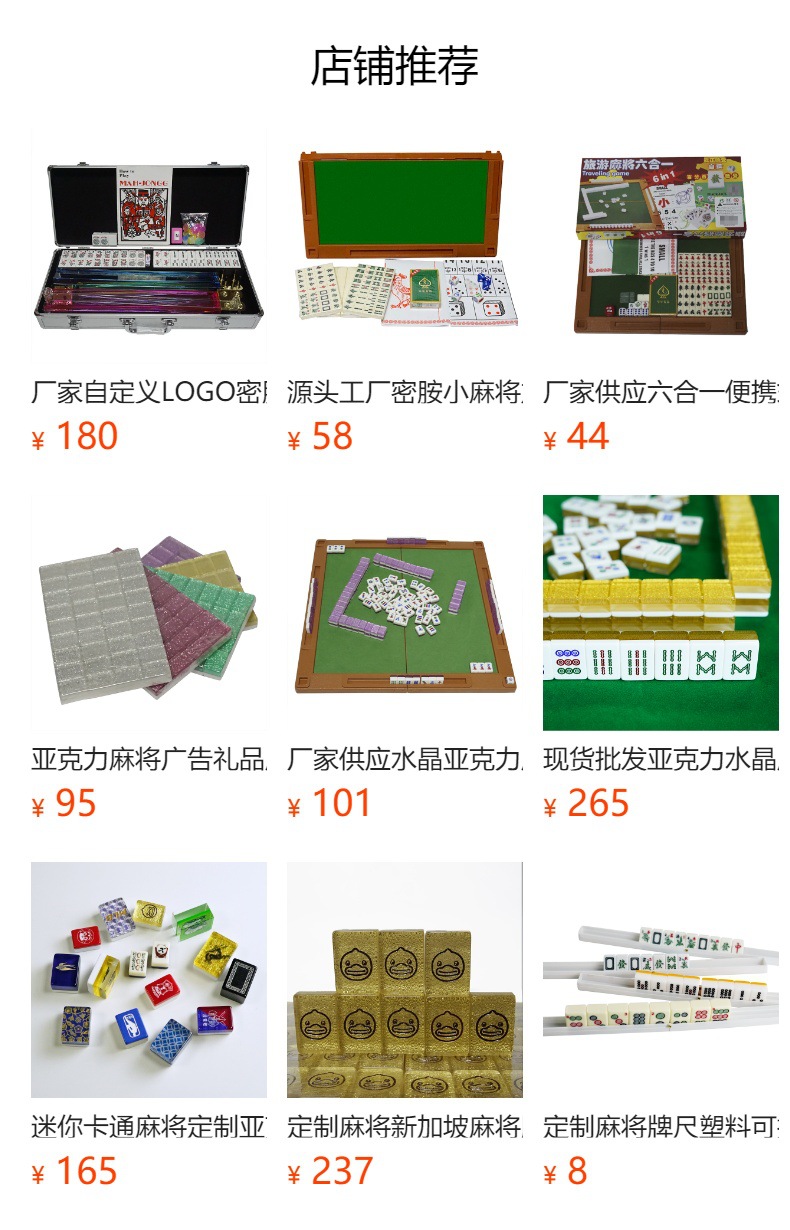 产品范围:主营产品为礼品麻将/游戏骰子/骰盅/娱乐转盘/幸运摇奖机/筹码/棋子/多米诺骨牌等一系列棋牌桌游产品,我们支持LOGO,尺寸,颜色以及包装定制,其他产品有钥匙扣挂件、汽车出风口香水夹、解压魔方、电子感应门铃。