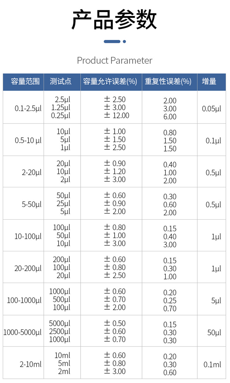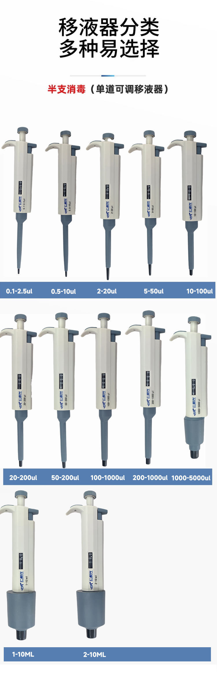 0.1-2.5UL; 0.5-10UL; 2-20UL; 5-50UL; 10-100UL; 20-200UL; 50-200UL; 100-1000UL; 200-1000UL; 1000-5000UL; 1-10ML; 2-10ML