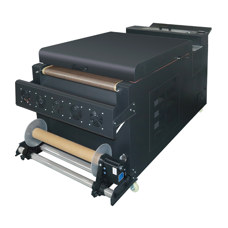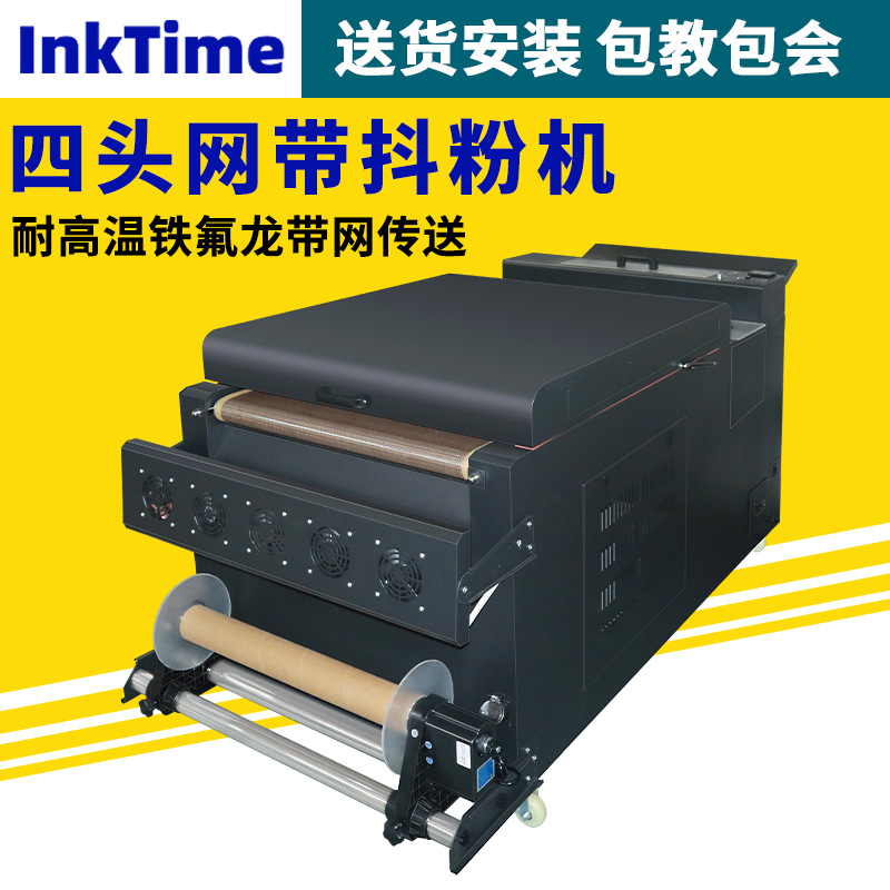 Высокоскоростная четырехголовочная машина для встряхивания порошка DTF с конвейерной лентой и печью для сушки, для термотрансферной печати белыми чернилами.