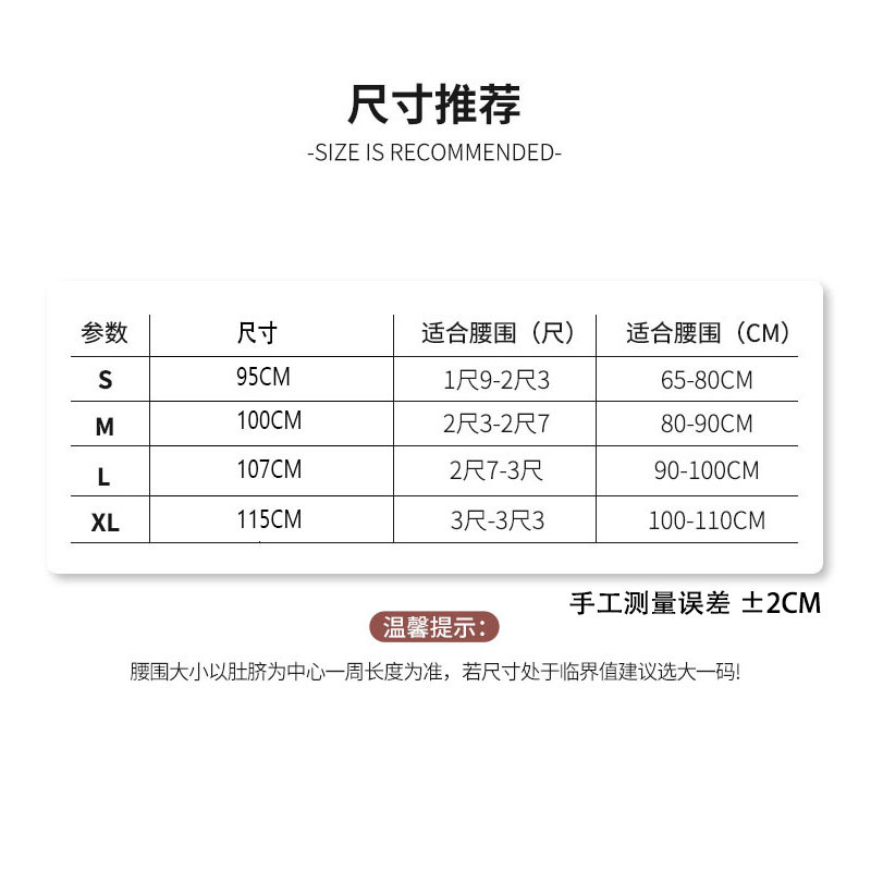 Талия S [1 фут 9-76.6cm ]; Талия М [2 фута 3-89.9cm ]; L талия [2 фута 7-99.9cm ]; Талия XL【99.9cm-109.9cm】