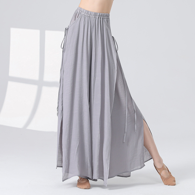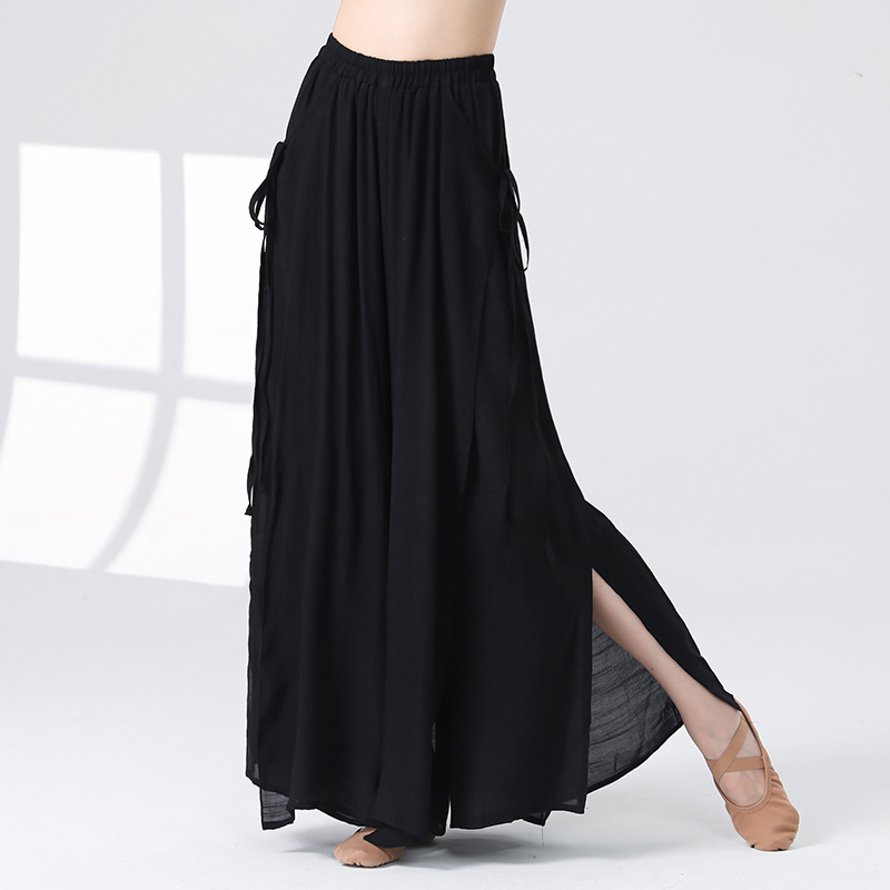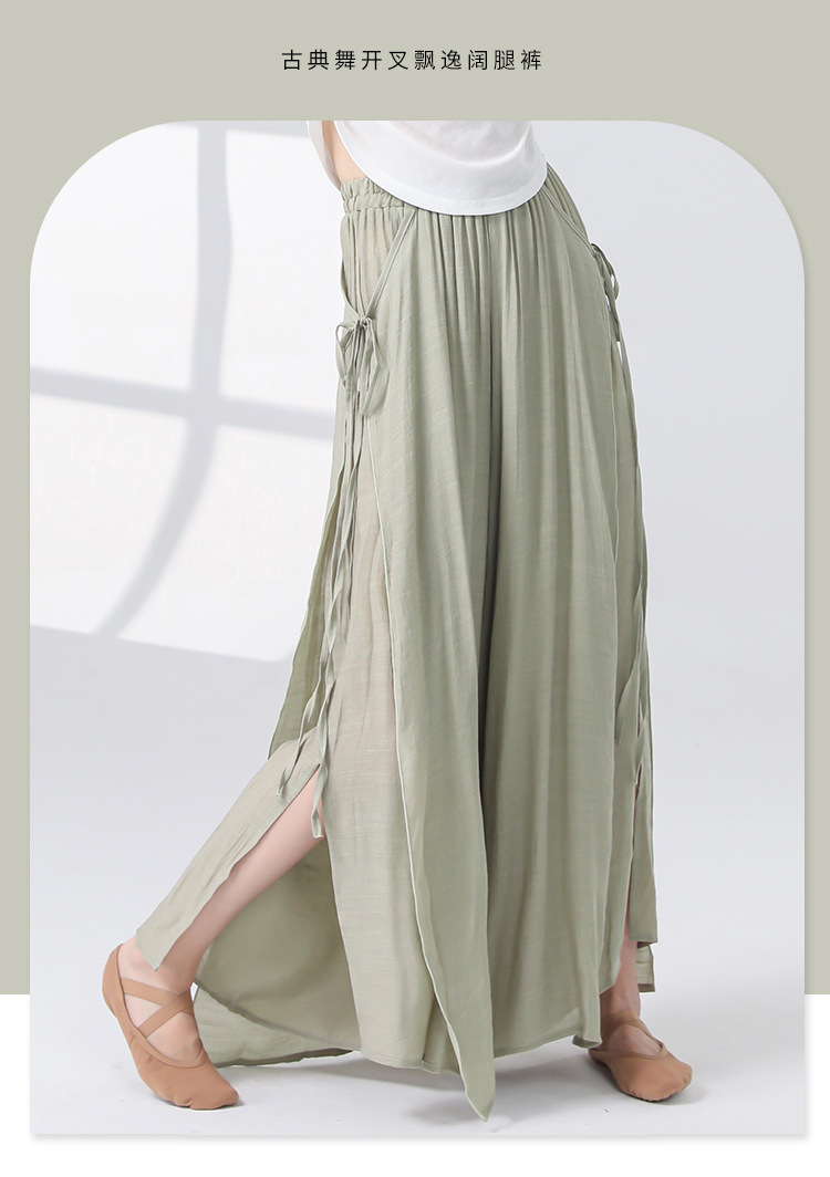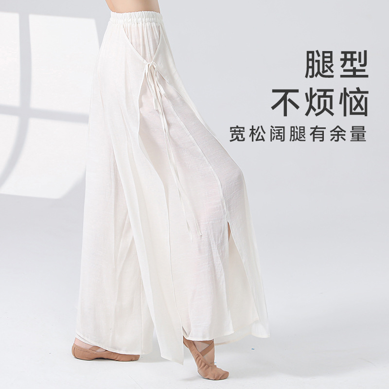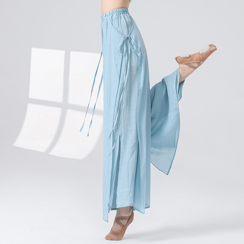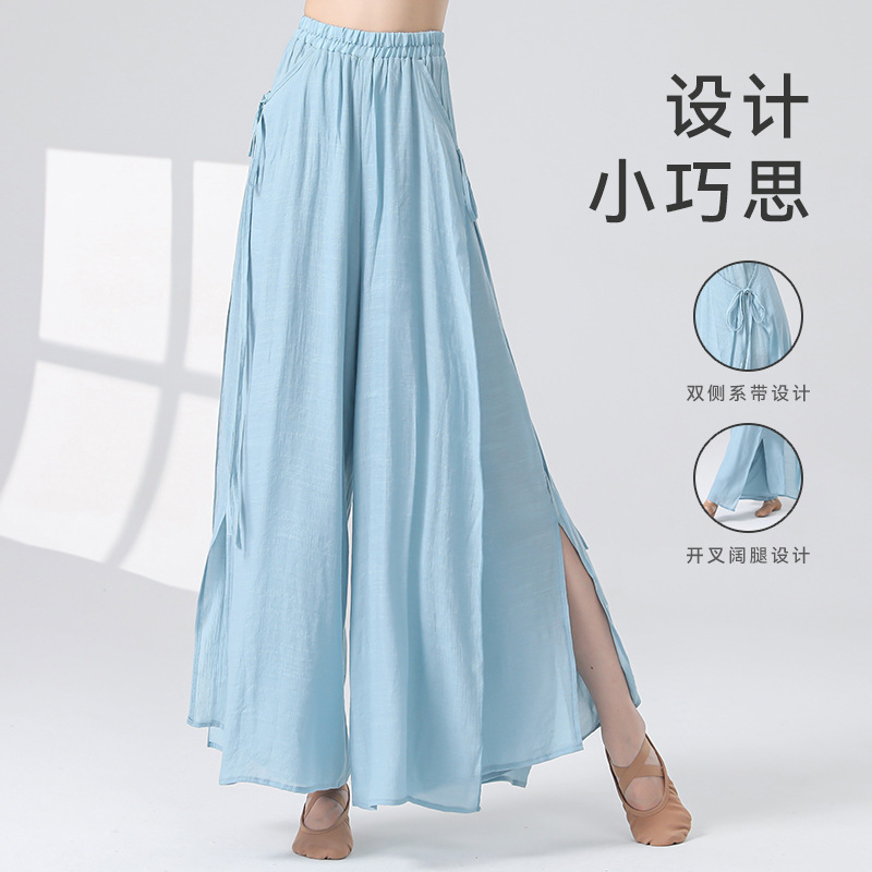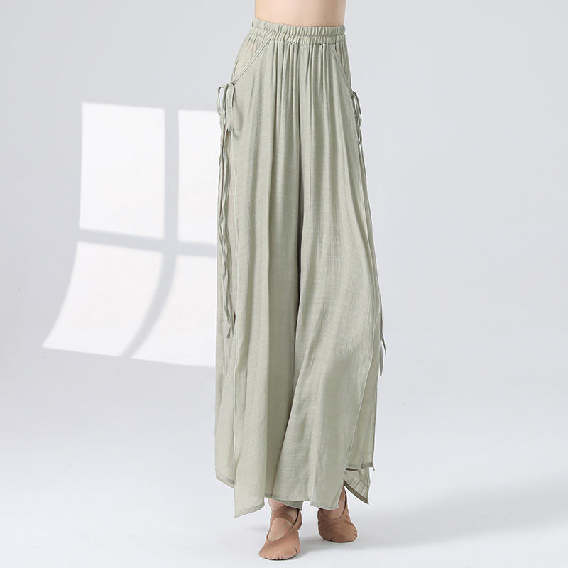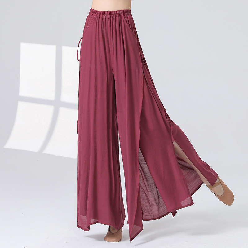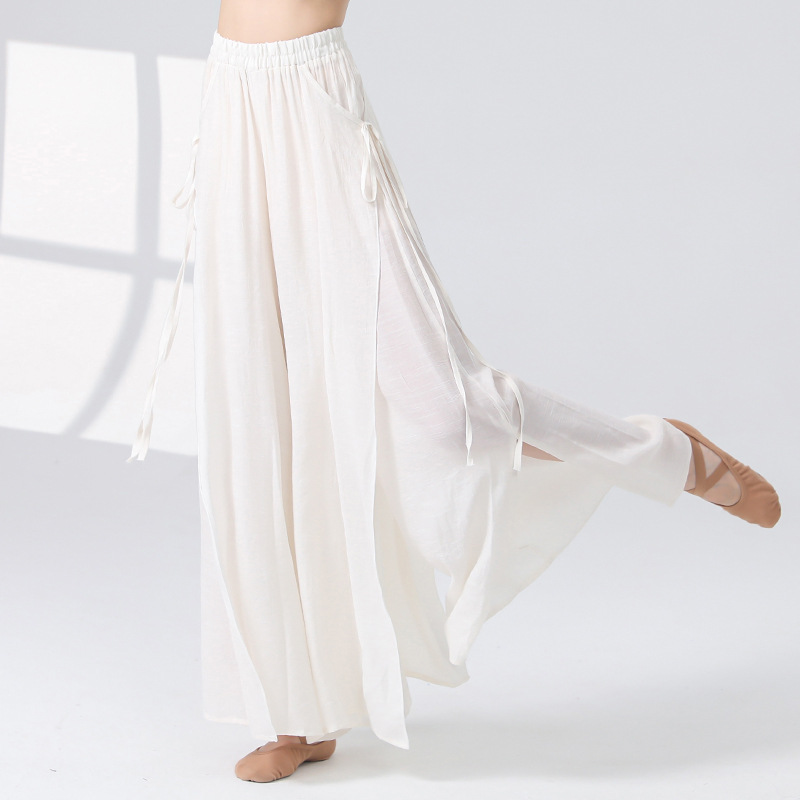 Женские универсальные брюки для занятий классическим танцем с высокой талией, свободного кроя, с разрезами и лентами, художественные широкие брюки в китайском стиле из хлопка и льна.