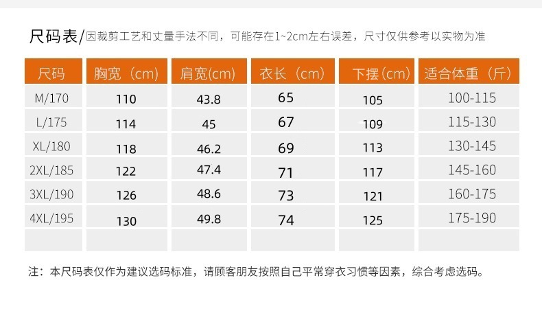 170/M; 175/L; 180/XL; 185/2XL; 190/3XL; 195/4XL