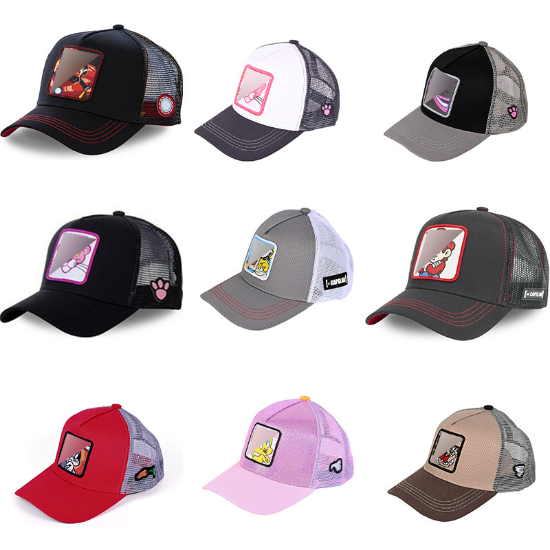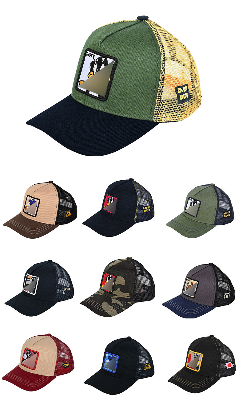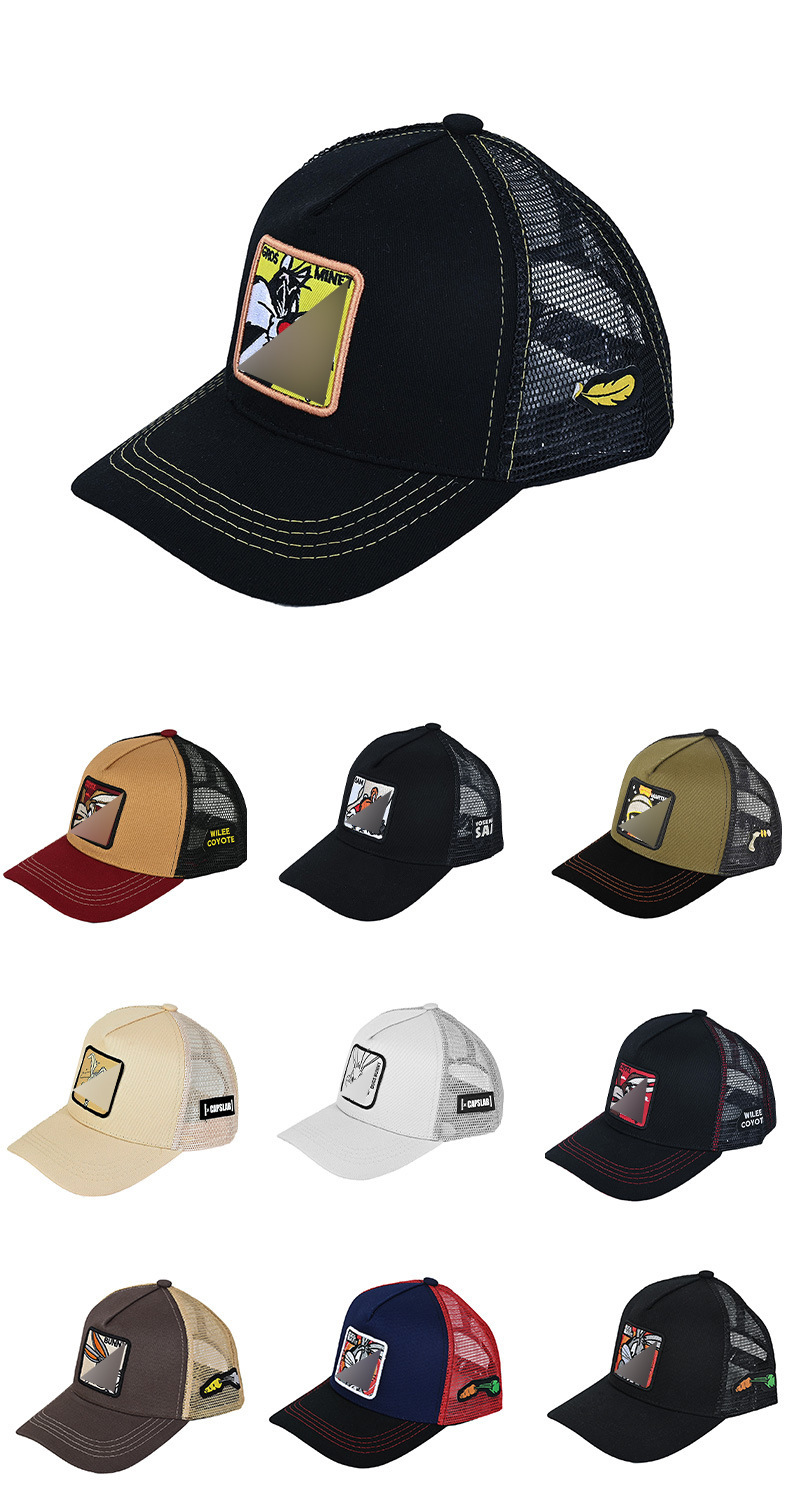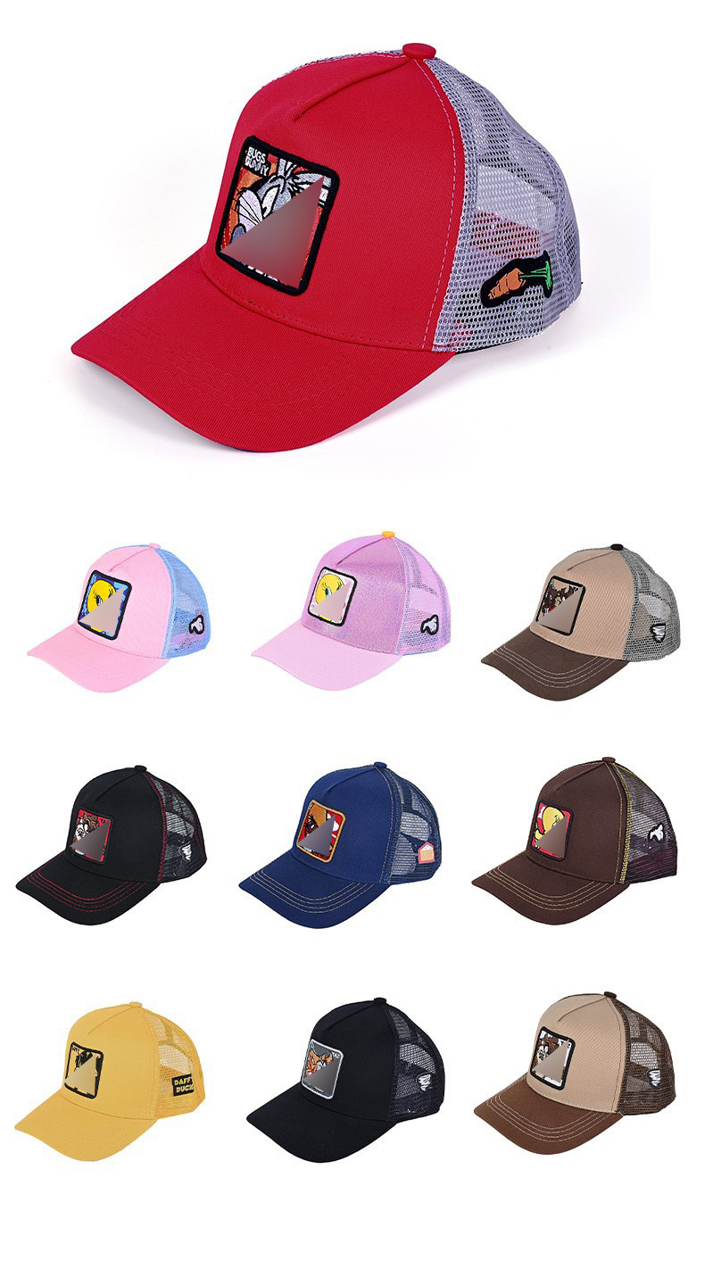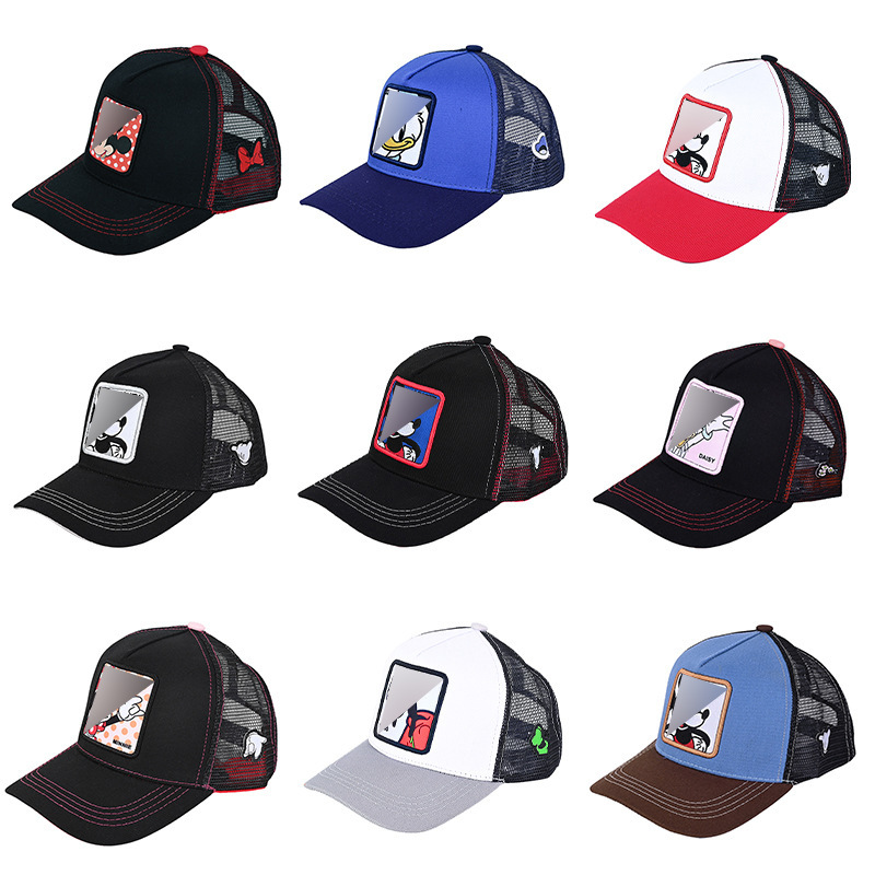 Кепка-тракер с широкими полями, вышивкой в виде мультяшных персонажей (мышь и кролик), дышащая и защищающая от солнца.