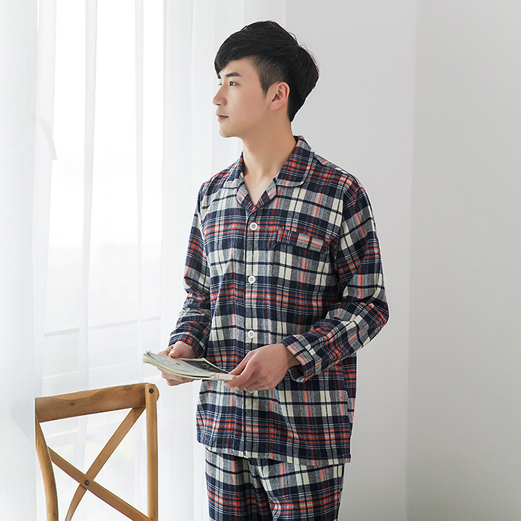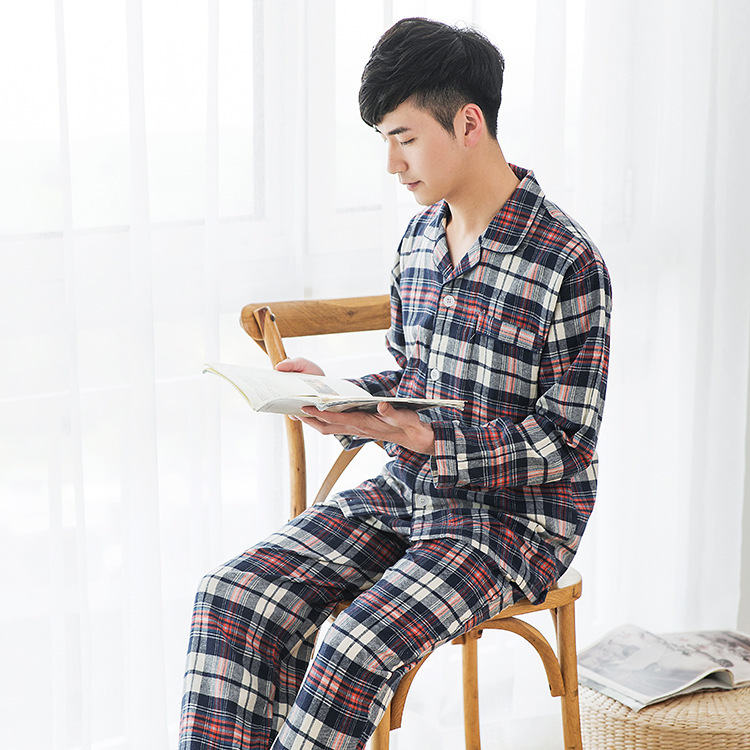 Весенний и осенний мужской хлопчатобумажный двухсторонний бархатный пижама повседневная сетка классическая лацканная домашняя одежда твил утолщение