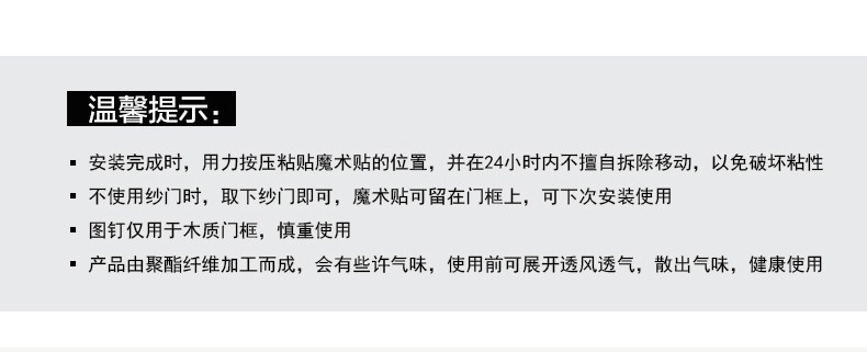 A:魔术贴适合木板、铝合金等,木板门可以用图钉二次固定。