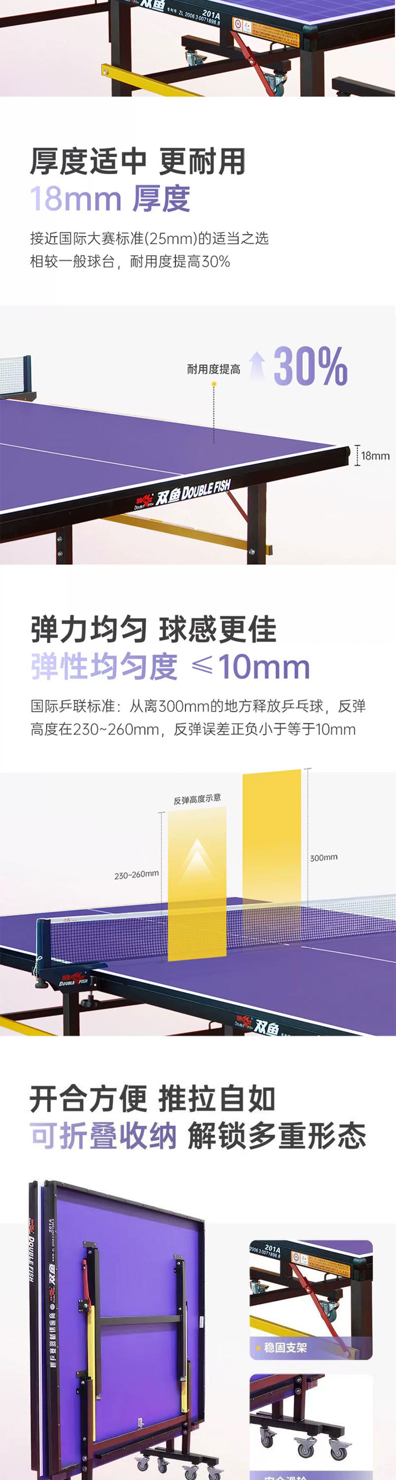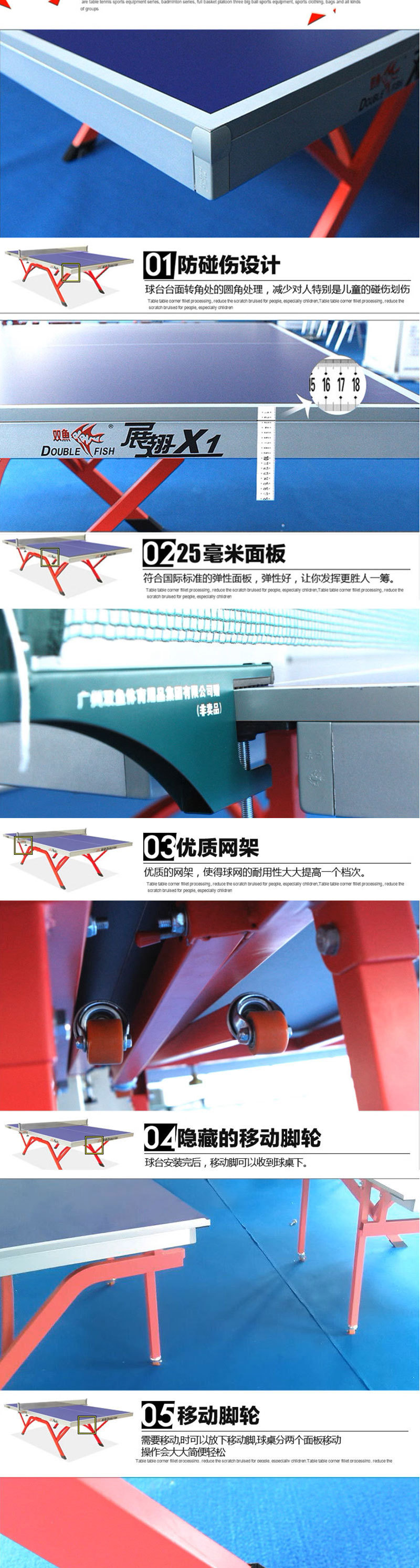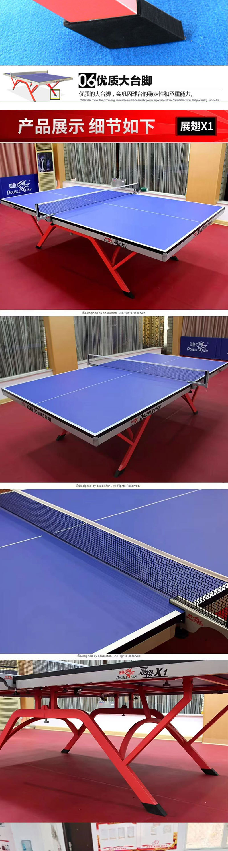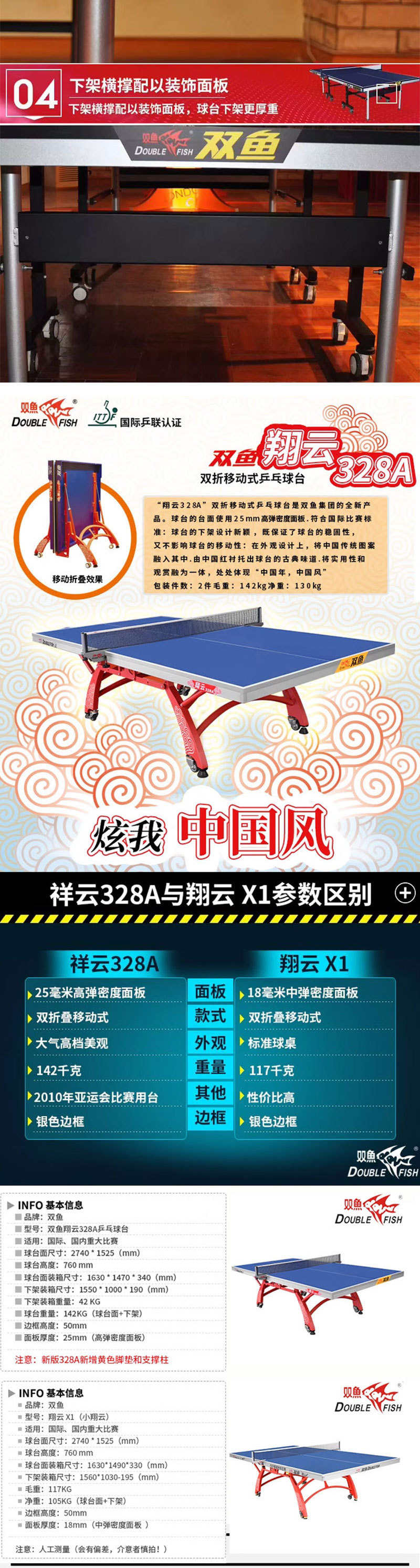 501А (стол 15 мм); 201А (шкив-стол 18мм); Развернутые крылья X1 (стол 25 мм); Сяньюнь X1 (18 мм столешница); 233 (сертифицировано ITTF, столешница 25 мм); Сяньюнь 328A (сертифицирован ITTF, столешница 25 мм); Дрим 3 (сертифицирован ITTF, 25 мм, настольный)