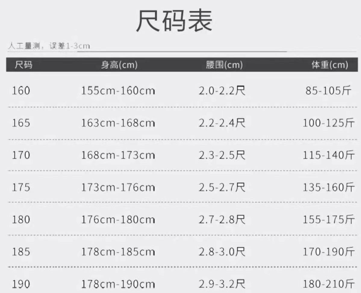 M/165; L/170; XL/175; 2XL/180; 3XL/185; 4XL/190; 5XL/195