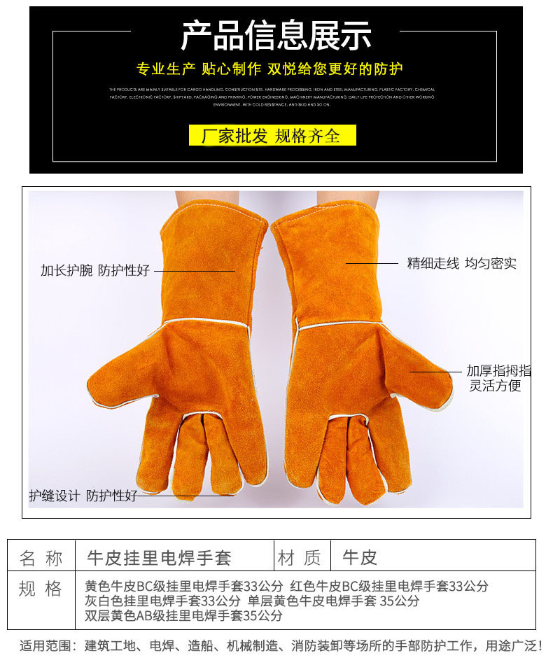 Сварочные перчатки из желтой воловьей кожи класса AB с подкладкой 33cm; Сварочные перчатки из желтой воловьей кожи класса B на подкладке 33cm; Сварочные перчатки с подкладкой из красной воловьей кожи класса AB 33cm; Сварочные перчатки из натуральной коровьей кожи класса AB с подкладкой 33cm; Однослойные сварочные перчатки из желтой воловьей кожи 35cm; Сварочные перчатки желтого класса А с подкладкой 35cm; Натуральные однослойные огнестойкие перчатки из воловьей кожи класса А.