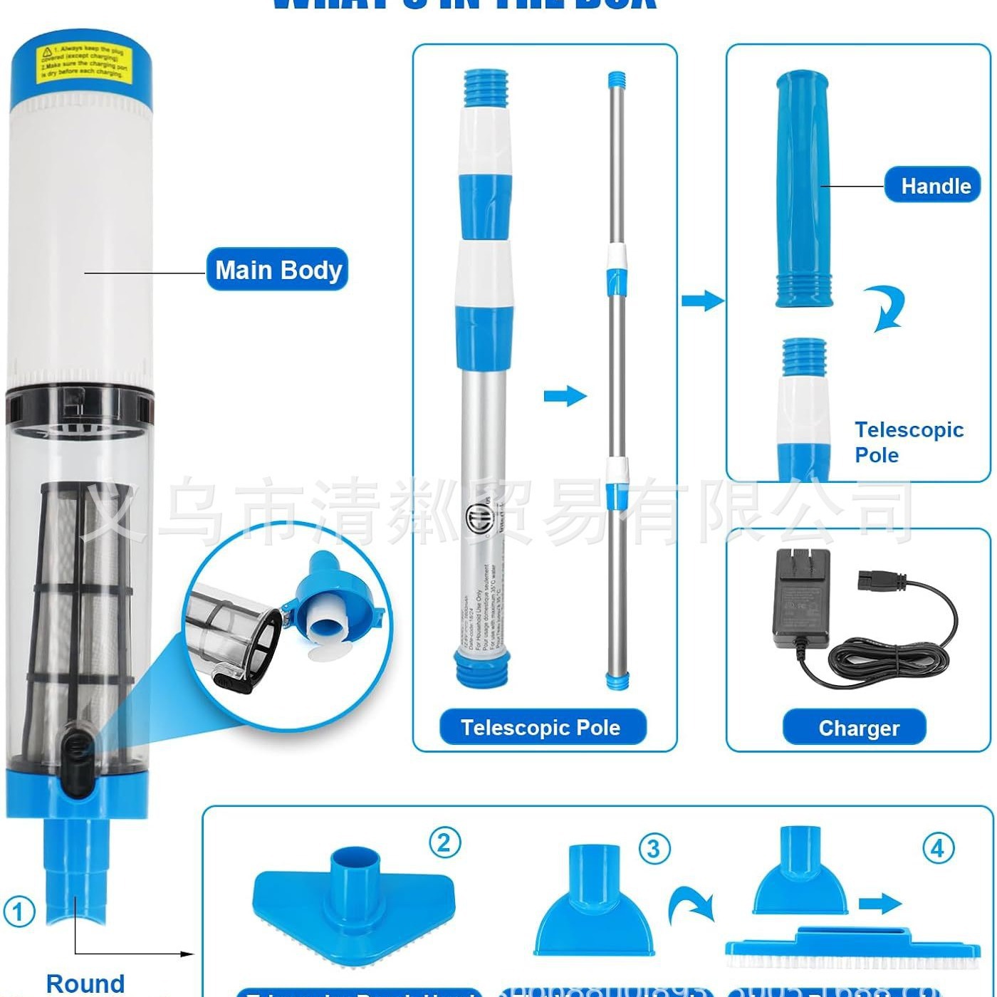 - 【操作方便】这款泳池清洁器轻巧紧凑的设计,易于在泳池周围操作,即使是最狭窄的位置。 其卓越的性能与易用性相辅相成,让您轻松清洁您的游泳池。 充满电需要2小时左右,充满电后可使用约2小时。