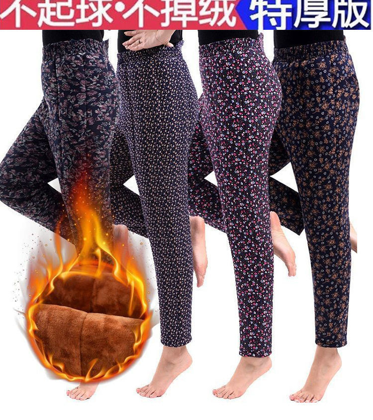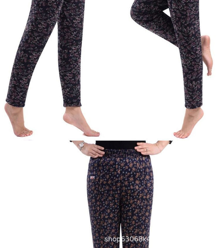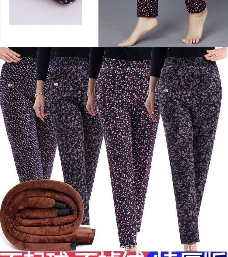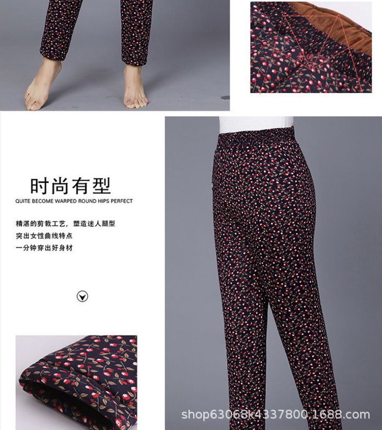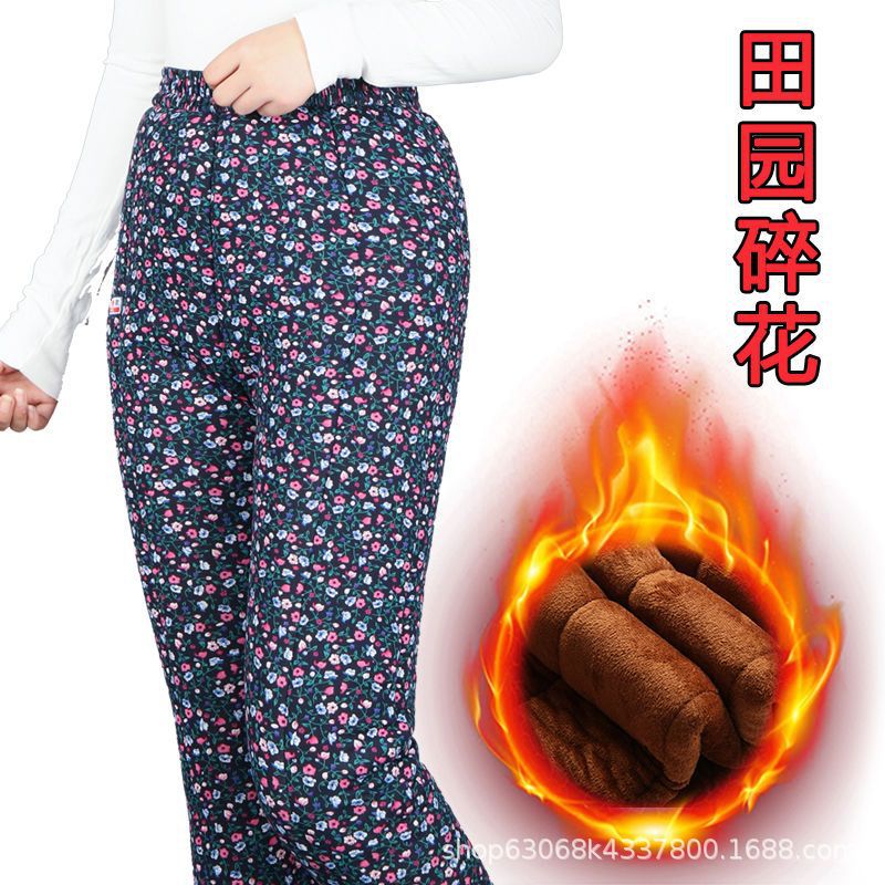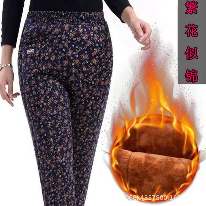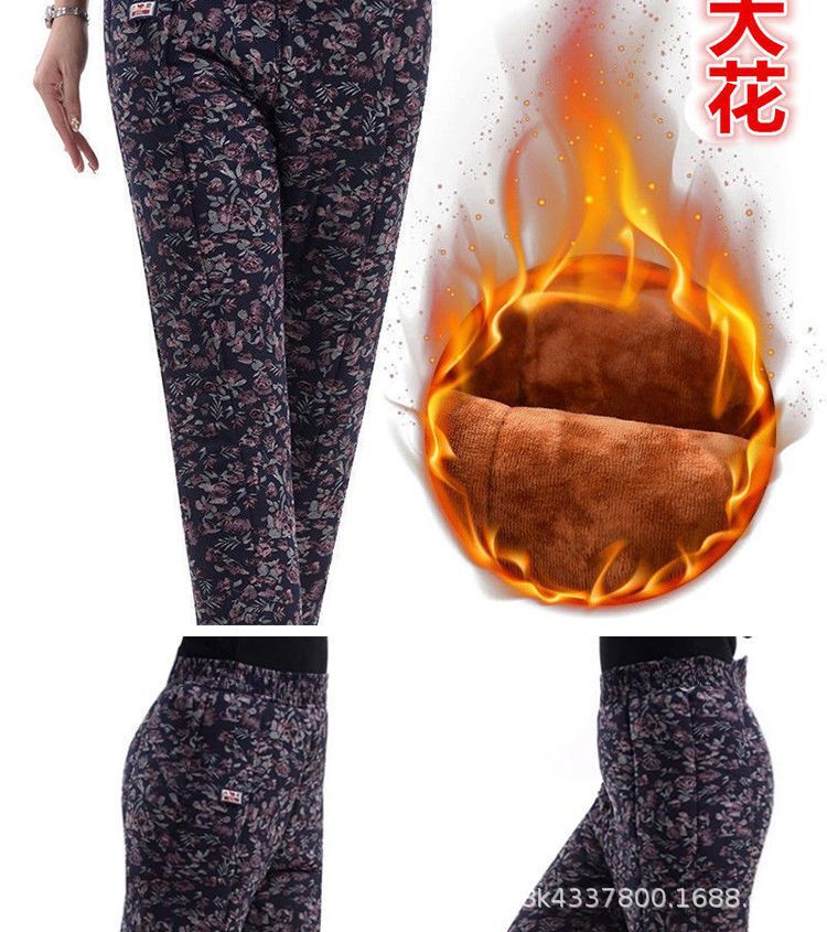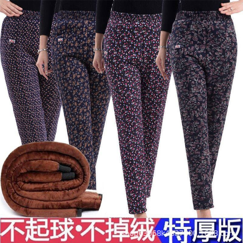 Брюки женские из верблюжьей шерсти и хлопка с цветочным принтом, трехслойные, с высокой талией, свободного кроя, больших размеров, подходят для женщин среднего и старшего возраста, устойчивые к холоду, ветрозащитные, с цветочным узором, в художественном стиле.
