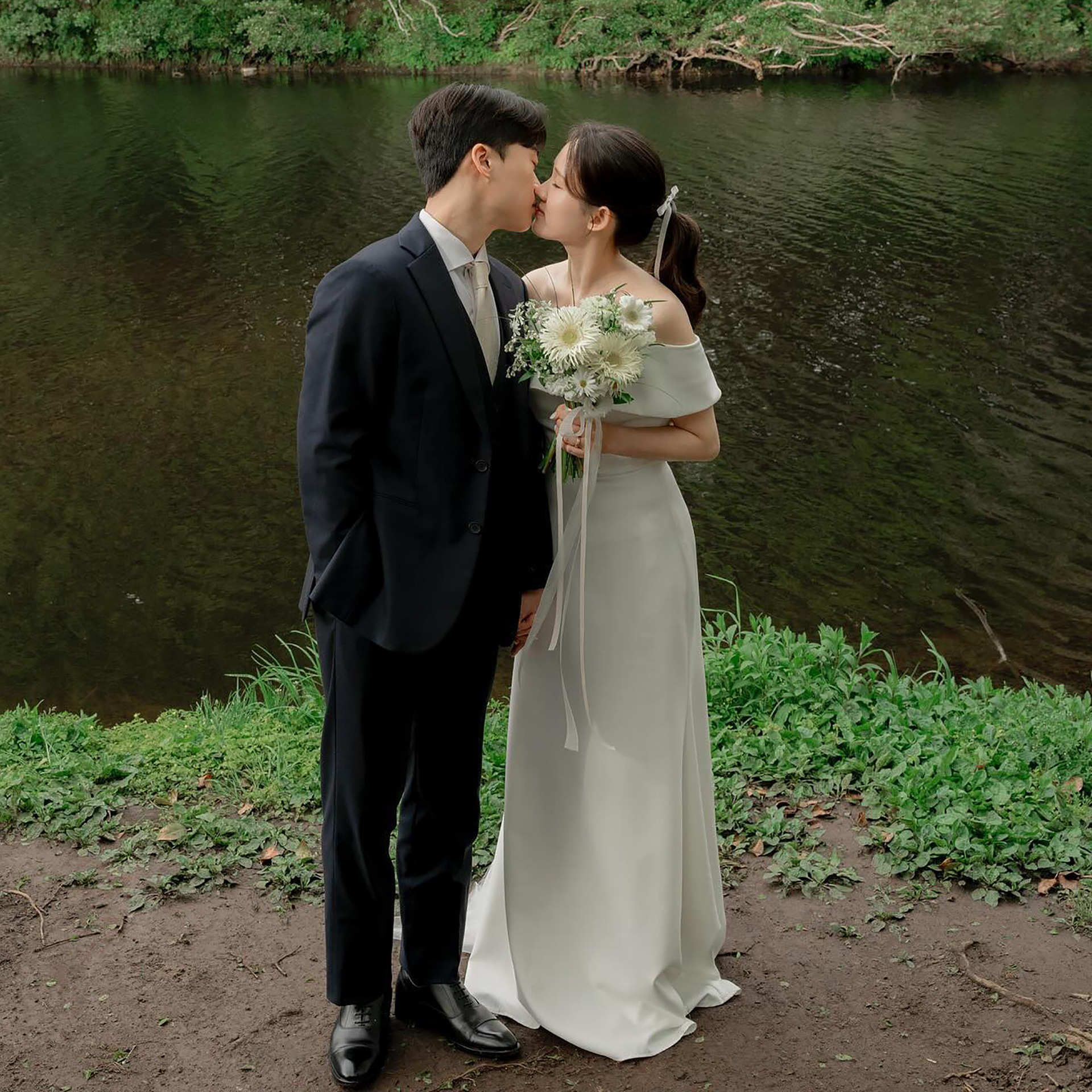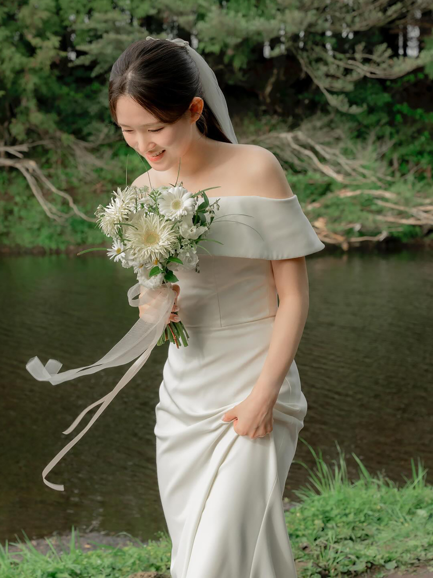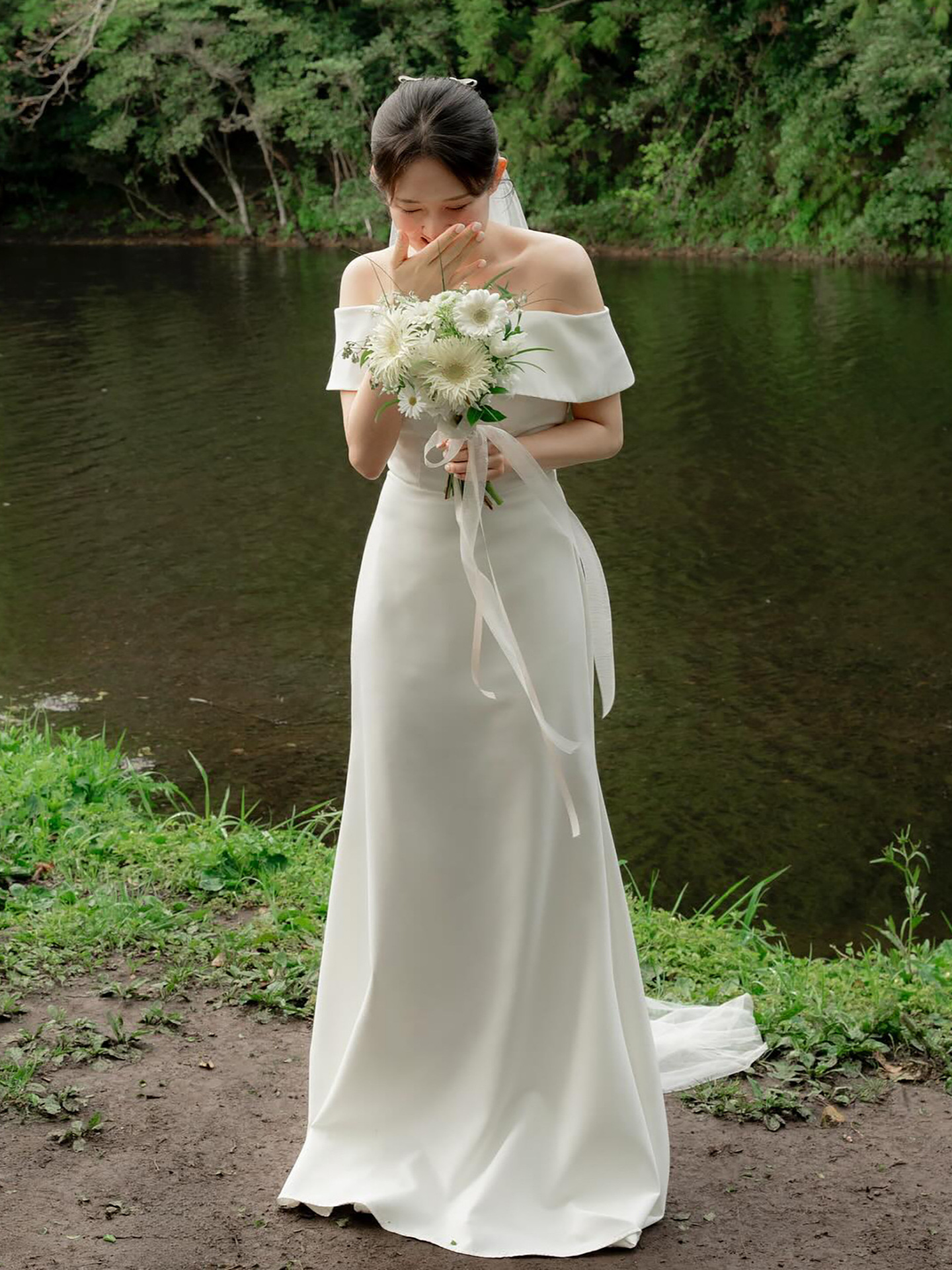 Корейское легкое свадебное платье простой рыбий хвост с рукавами на плечах и лотосах