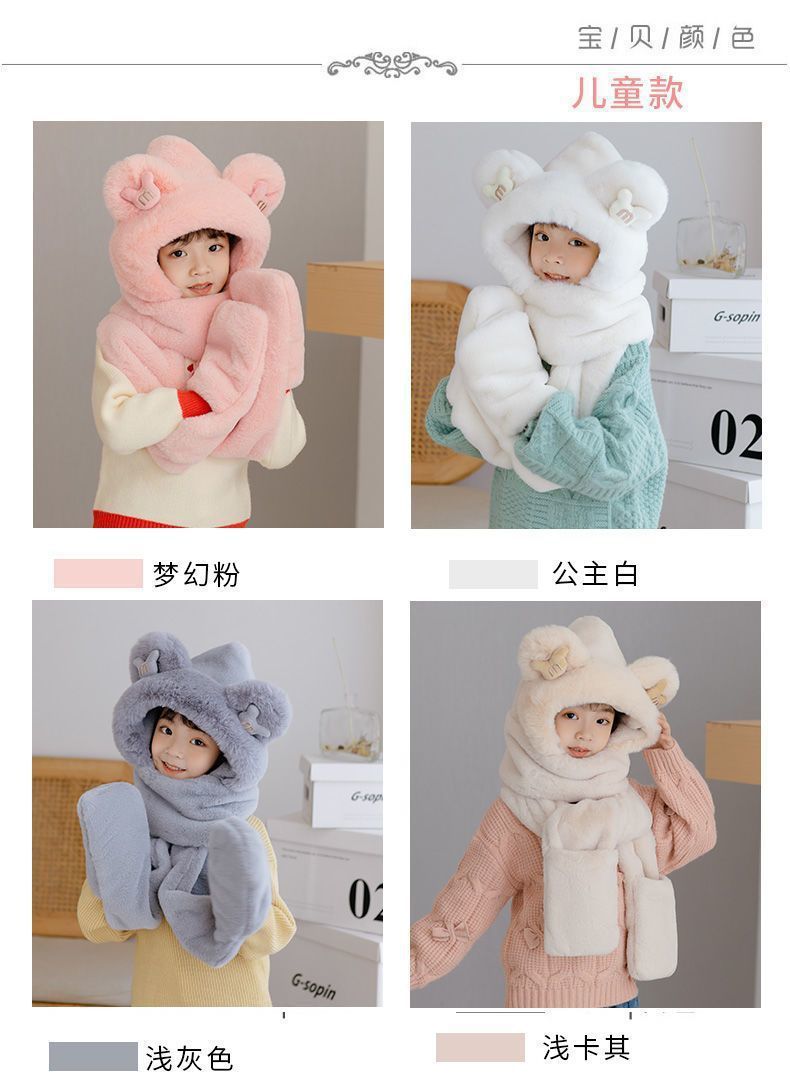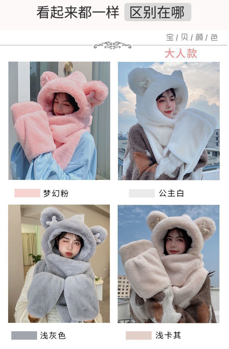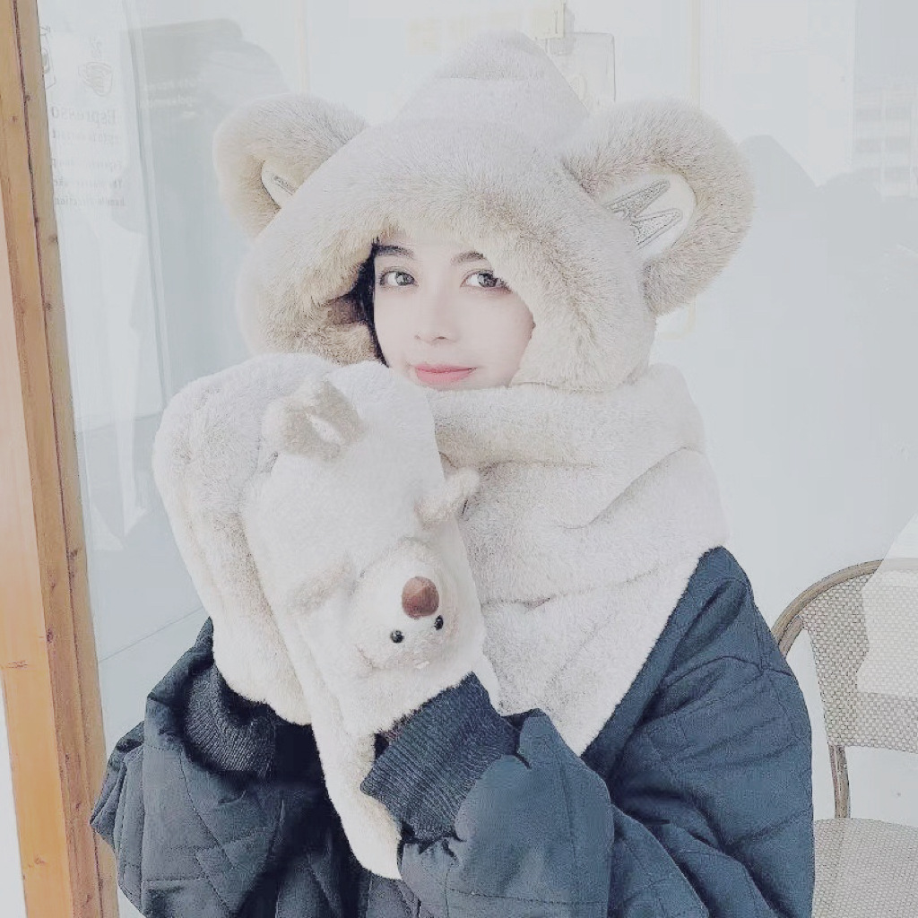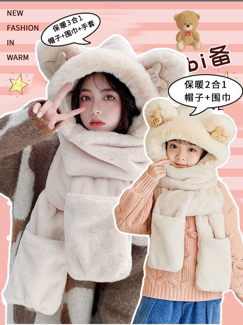 Шапка с медведем, женская мягкая шапка, женская зимняя шапка, шарф, встроенные перчатки, бархатная утолщенная детская шапка, комплект из трех предметов