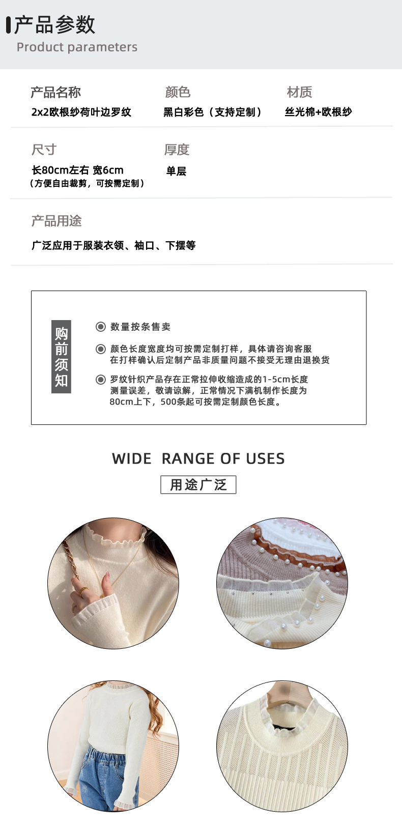 关于产品(必读):该款罗纹按条售卖,是手工抽好线后一条一条的,边角会有少量抽线时不可避免的脱线线头存在,剪刀剪后缝线缝在衣领内侧正常情况不影响产品使用,如有介意请勿下单,小本生意不接受由此造成的单条换货退款,可联系客服按原包装整件自行付邮退货退款,感谢理解。