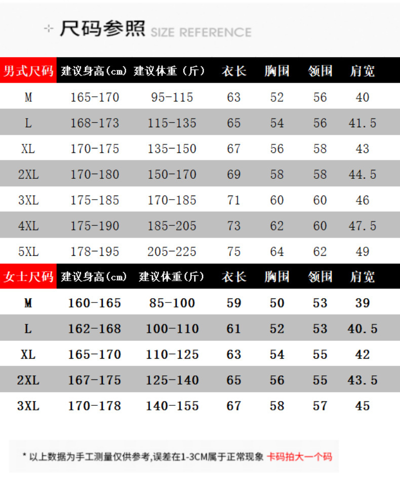 М (мужчина 95-115. женщина 42.5-50kg ); L (Мужчина 115-135. Женщина 50-55kg ); XL (мужчины 135–150. женщины 55-62.5kg); XXL (мужчины 150-170. женщины 62.5-70kg); 3XL (мужчины 170-185. Женщины 70-77.5kg); 4XL (мужчина 92.5-102.5kg ); 5XL (мужчина 10-112.5kg )