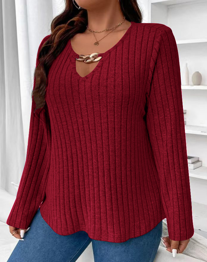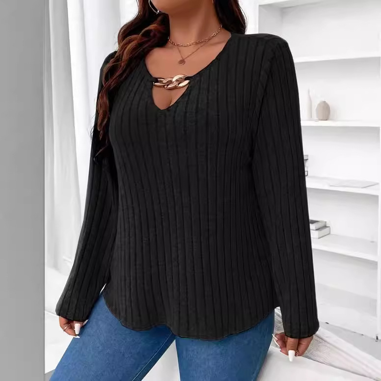 2024 трансграничный Amazon TEMU осень-зима новый сплошной цвет большой размер женский элегантный топ с V-образным вырезом ямы футболка с длинными рукавами